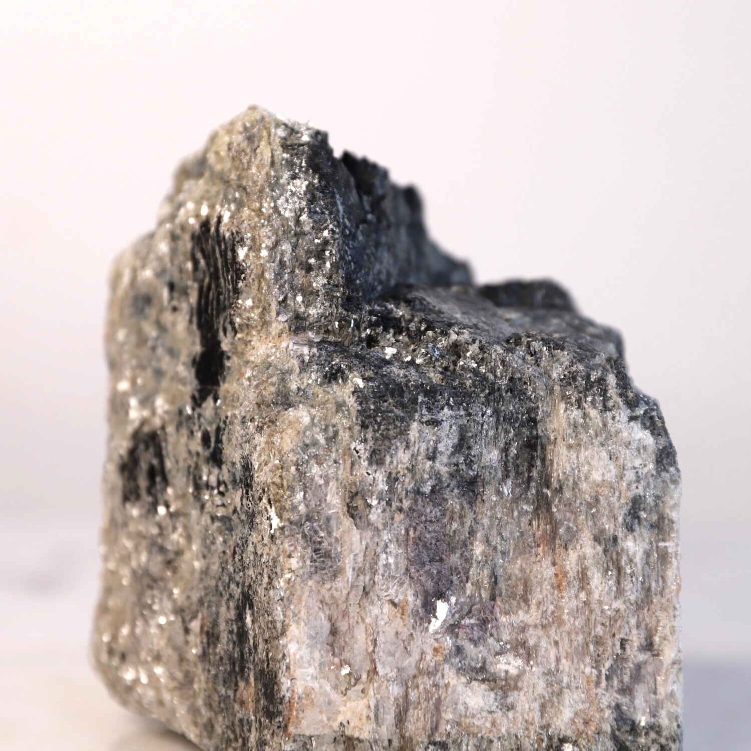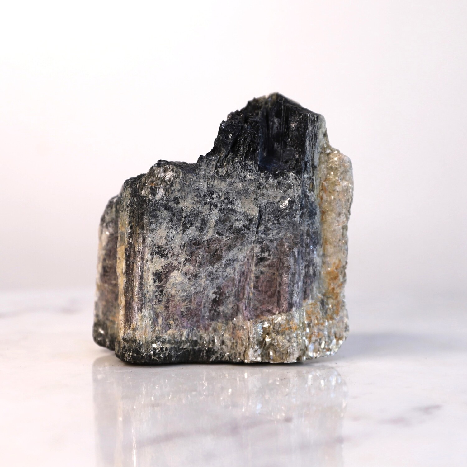 Raw black tourmaline crystal with white and golden mica colour tones.