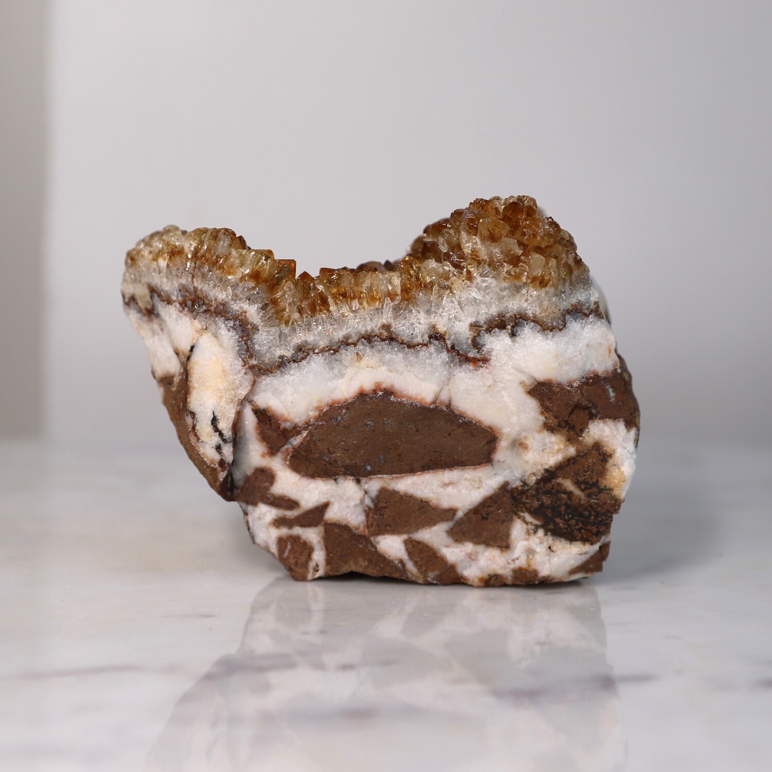 Geology: Citrine is a microcrystalline form of Quartz, as is Amethyst, a mineral based on silicon dioxide. Its physical properties are those of Quartz. Citrine can be found in the same geological environments as smoky quartz and is often intergrown with it. Found in metamorphic and igneous rocks. Contrary to Amethyst, Citrine crystals my show a macro mosaic structure and become very large. It is said to have vitreous lustre which becomes duller in large stones.