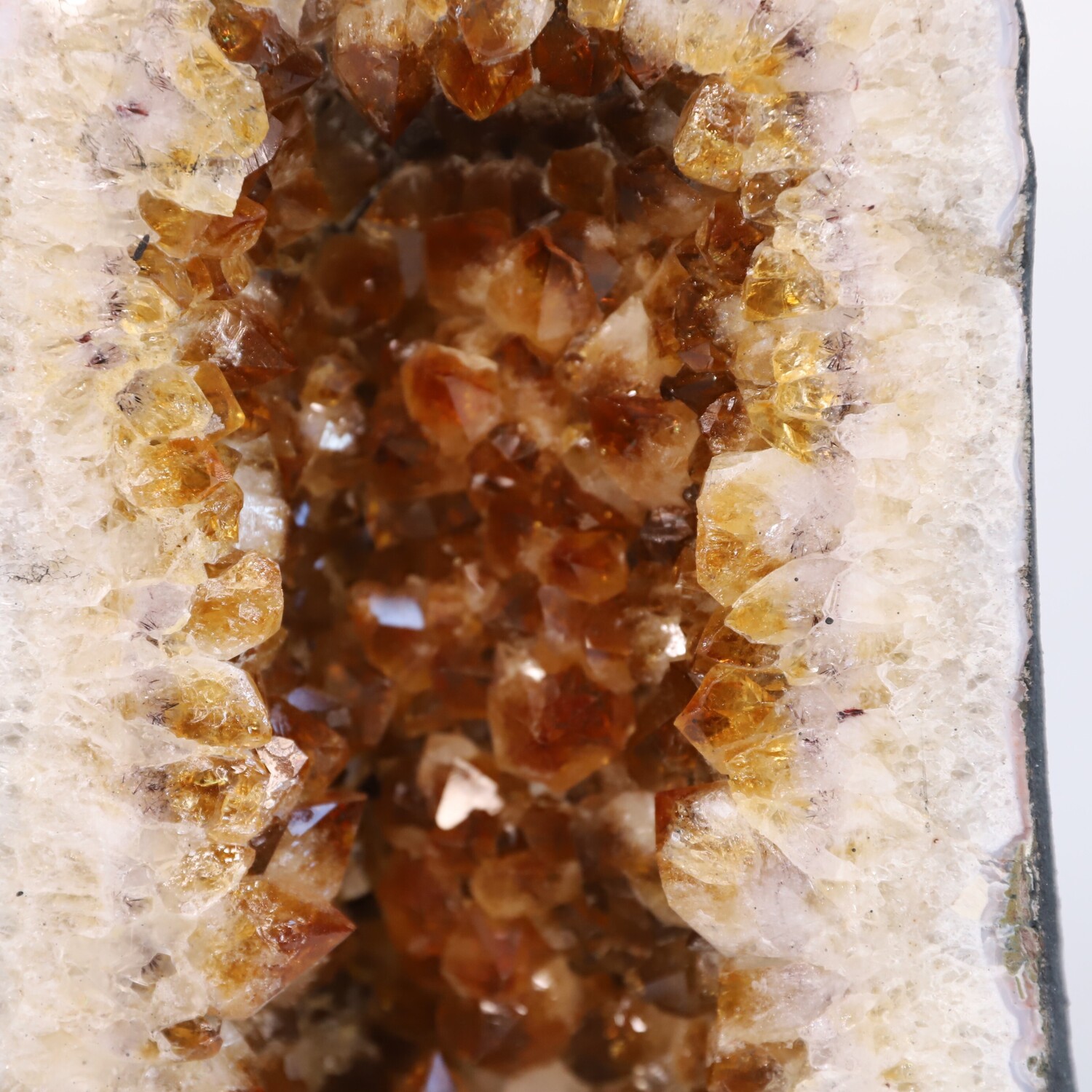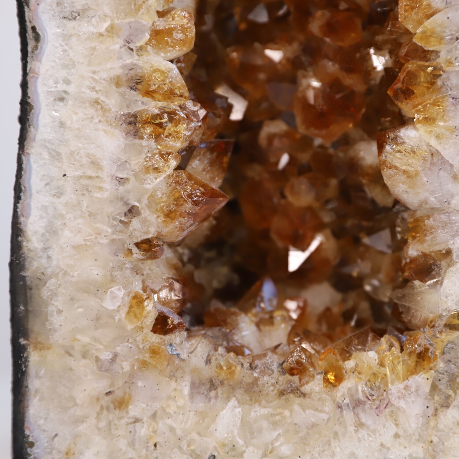 Geology: Citrine is a microcrystalline form of Quartz, as is Amethyst, a mineral based on silicon dioxide. Its physical properties are those of Quartz. Citrine can be found in the same geological environments as smoky quartz and is often intergrown with it. Found in metamorphic and igneous rocks. Contrary to Amethyst, Citrine crystals my show a macro mosaic structure and become very large. It is said to have vitreous lustre which becomes duller in large stones.