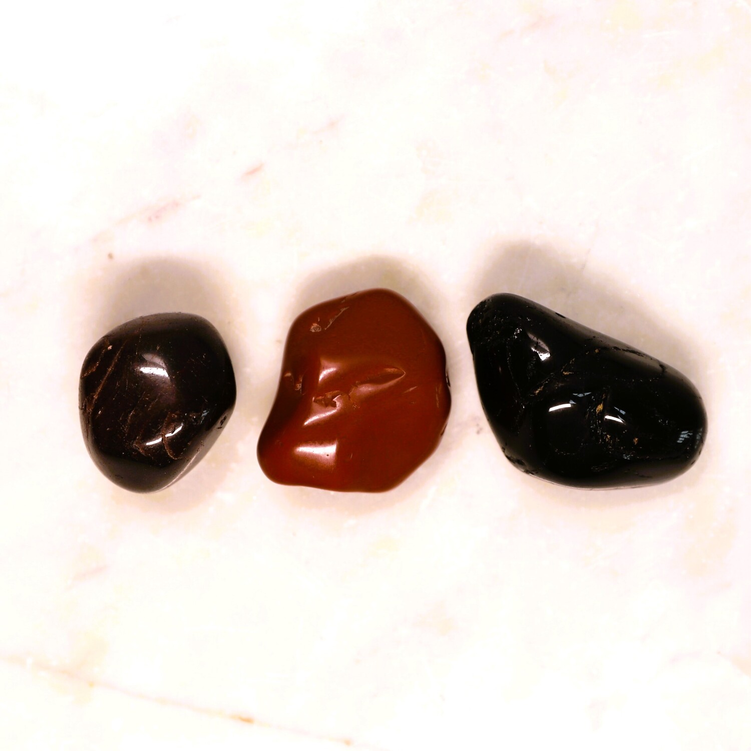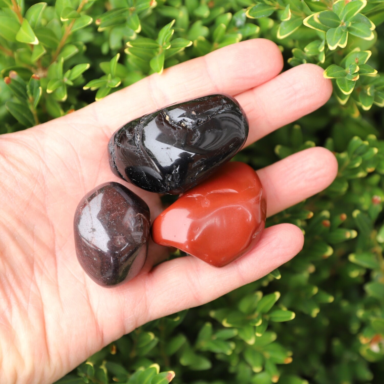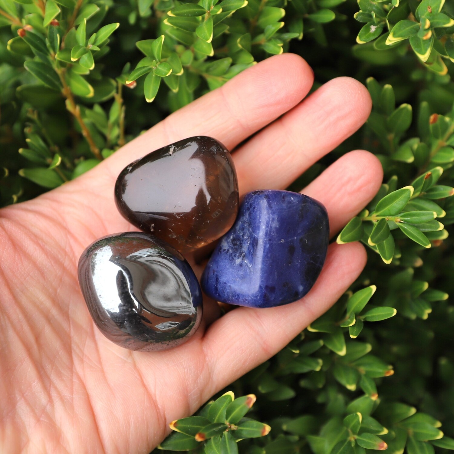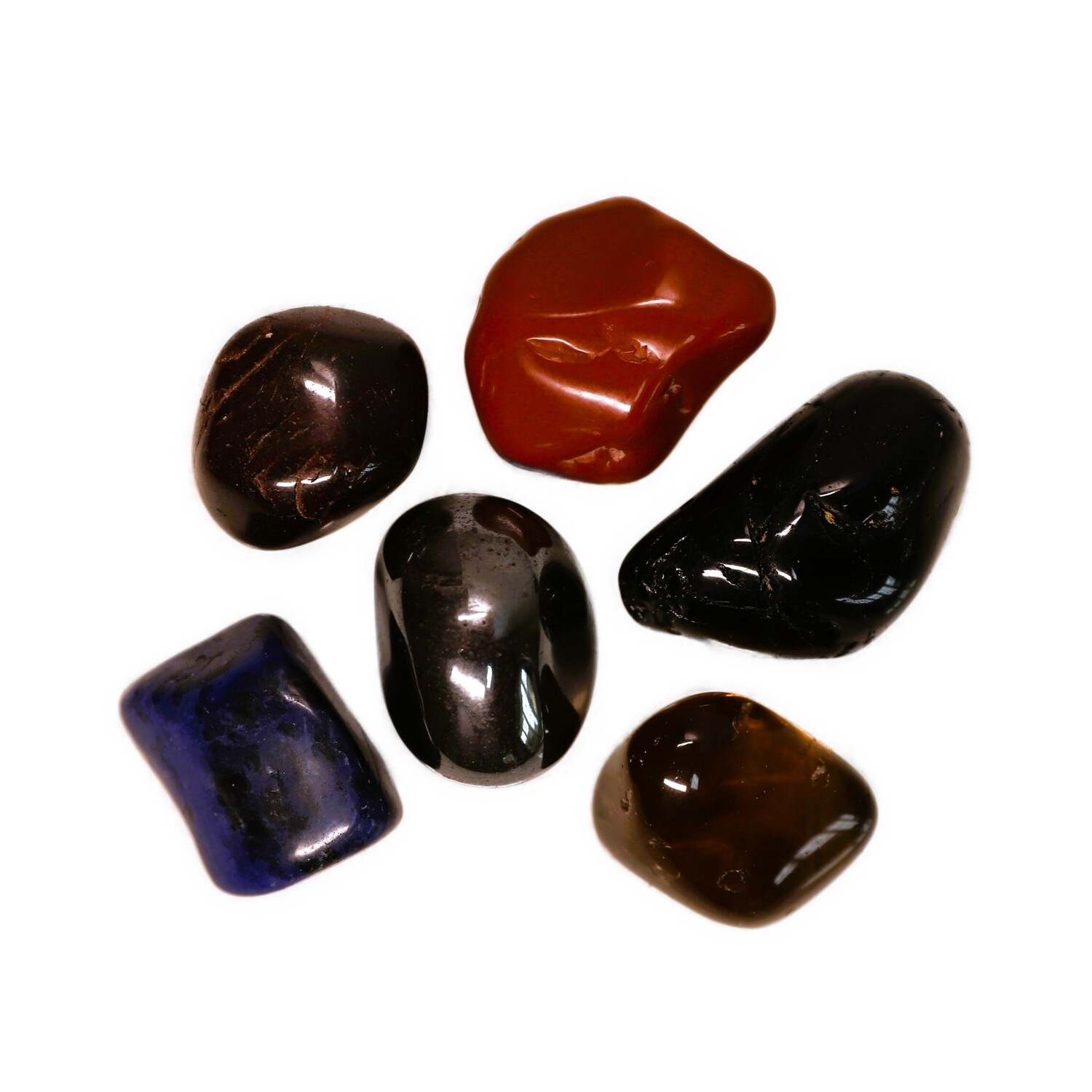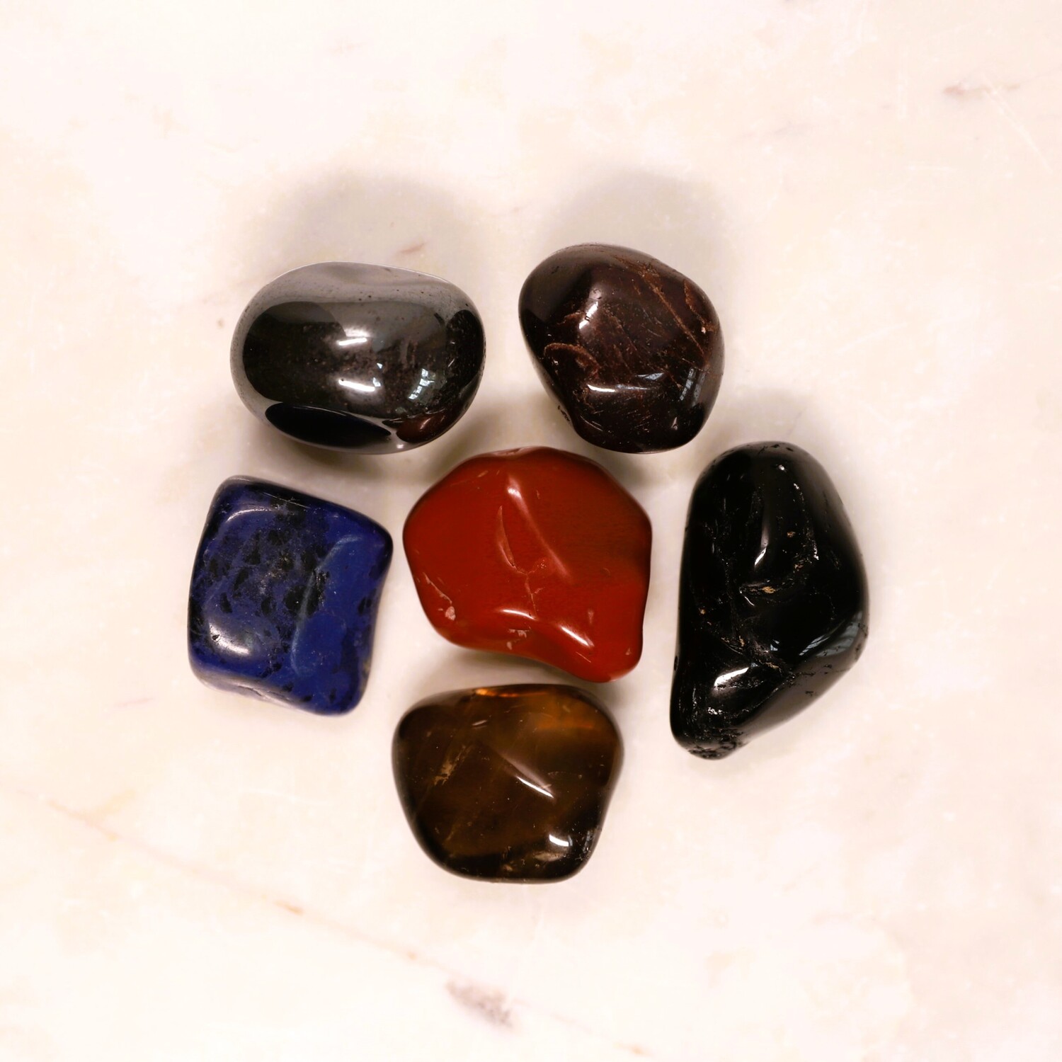 1 x Sodalite large tumble stone, 1 x Red Jasper large large tumble stone, 1 x Hematite large tumble stone, 1 x Smoky Quartz tumble stone, 1 x Black Tourmaline tumble stone, 1 x Almandine Garnet tumble stone, 1 x Selenite charging plate.