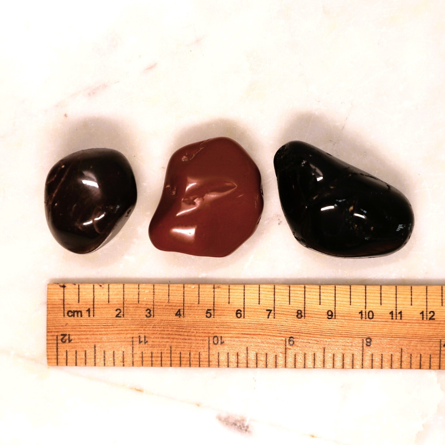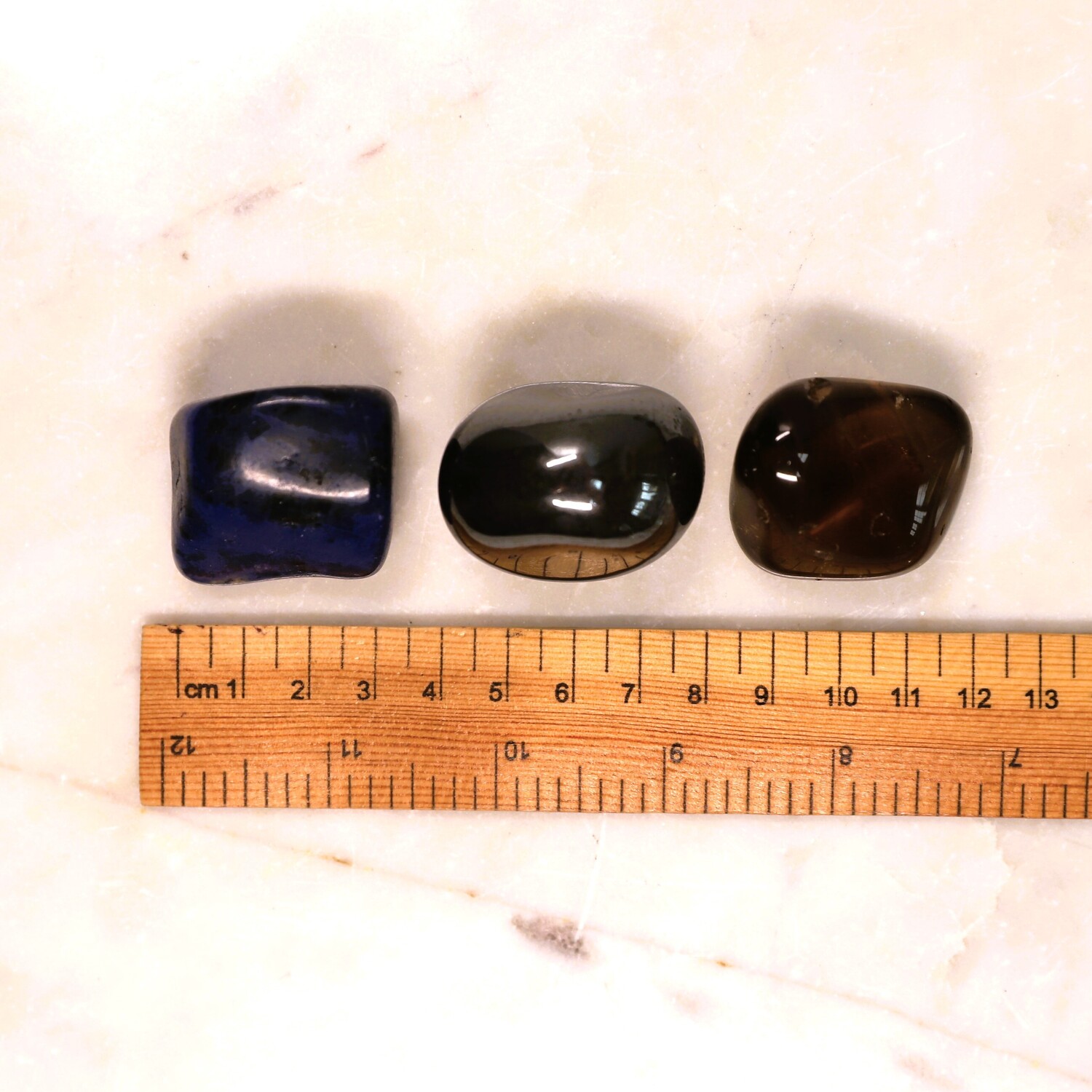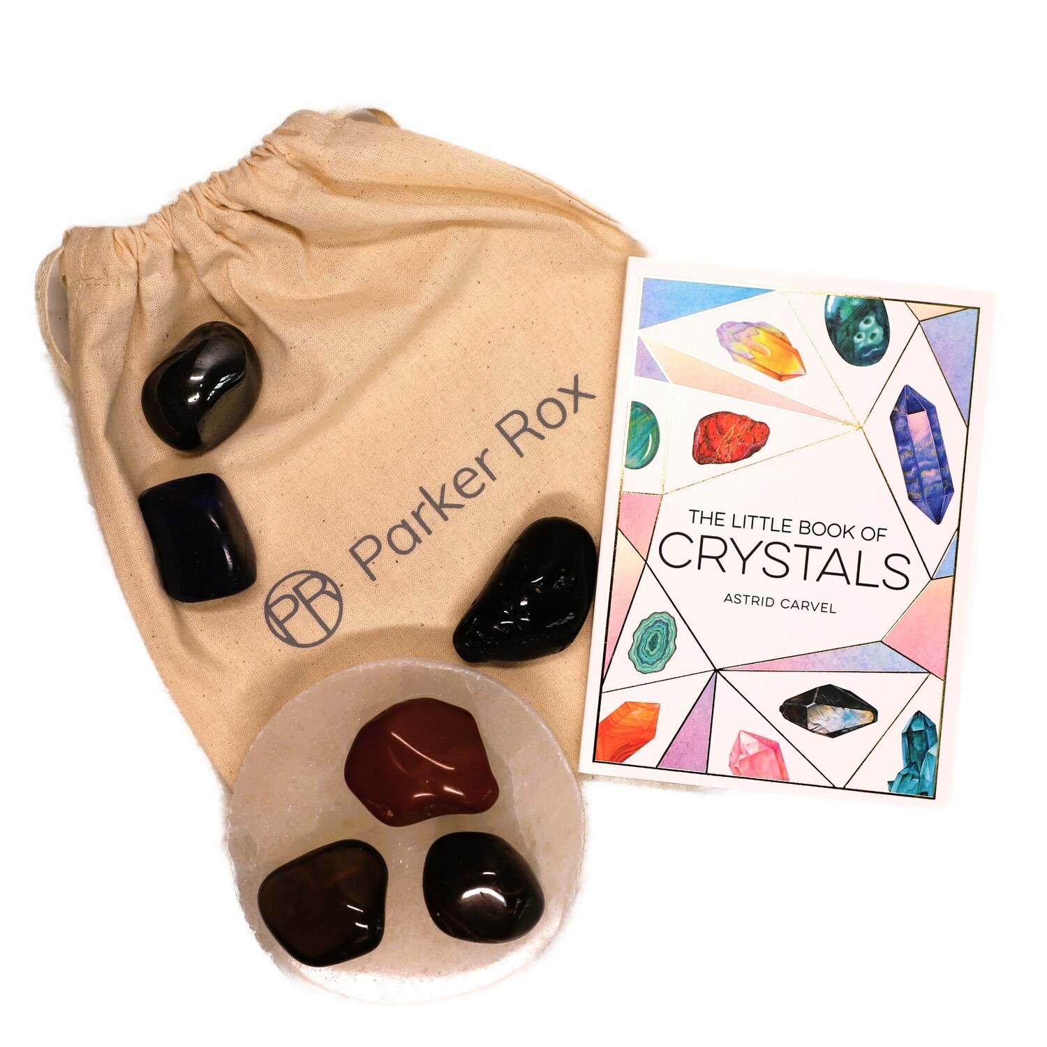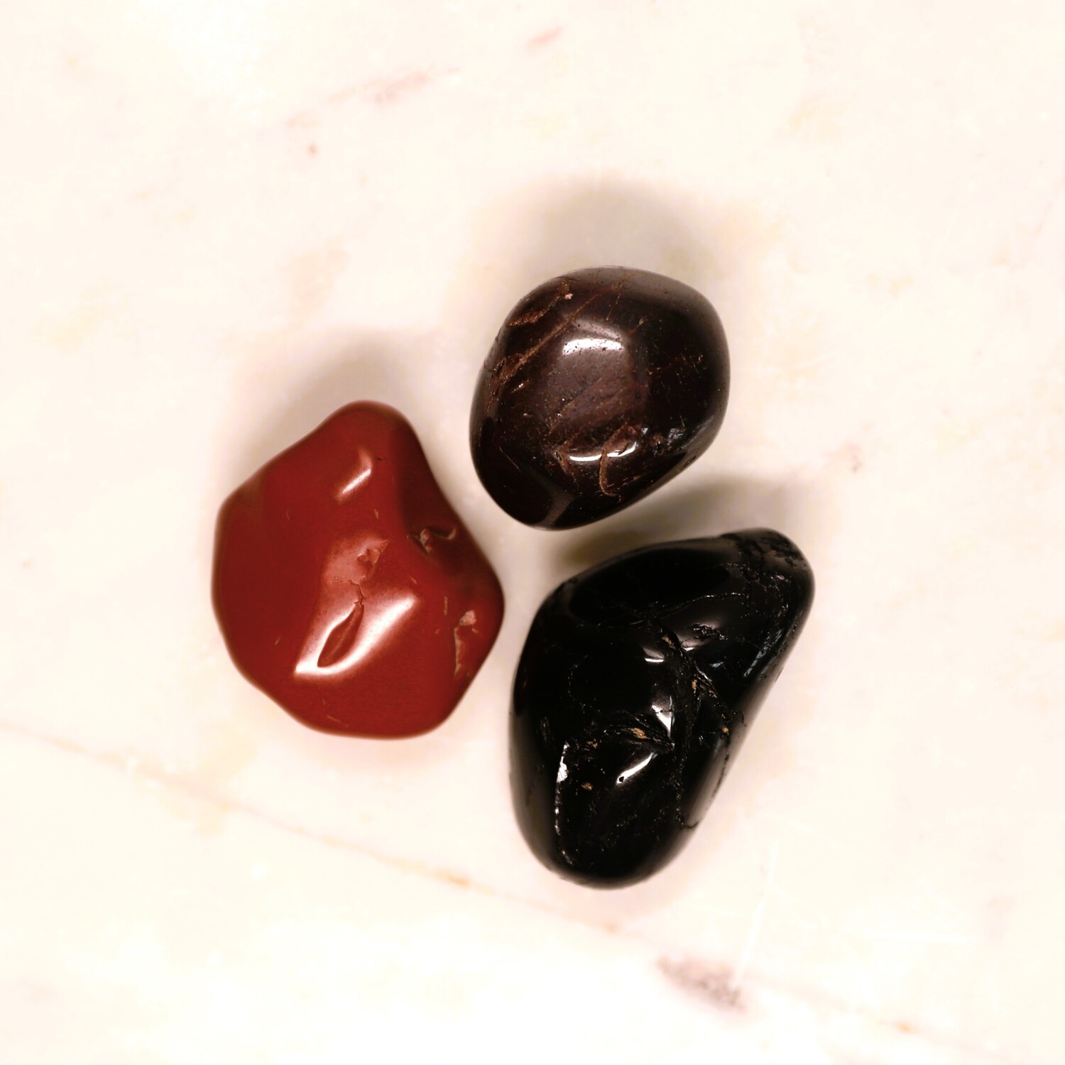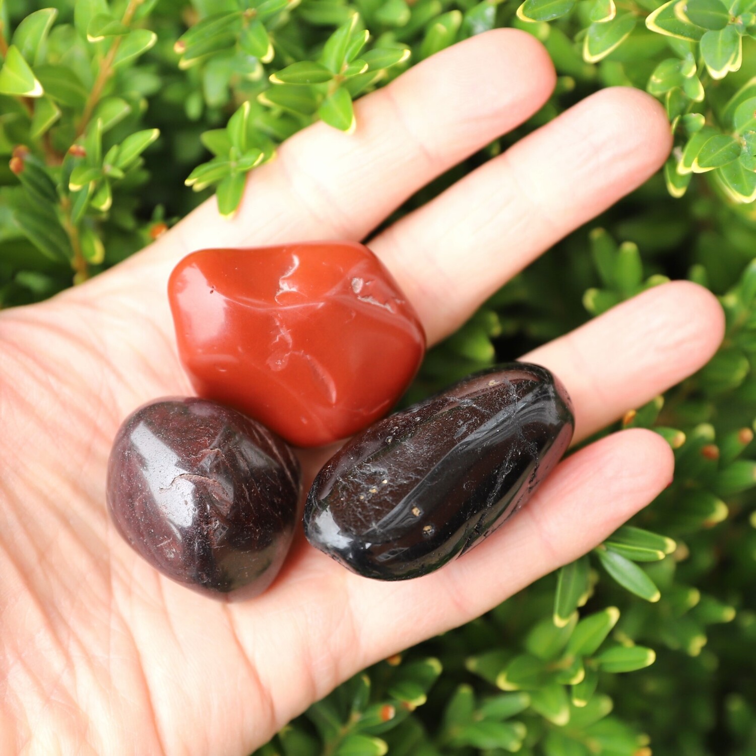 1 x Sodalite large tumble stone, 1 x Red Jasper large large tumble stone, 1 x Hematite large tumble stone, 1 x Smoky Quartz tumble stone, 1 x Black Tourmaline tumble stone, 1 x Almandine Garnet tumble stone, 1 x Selenite charging plate.