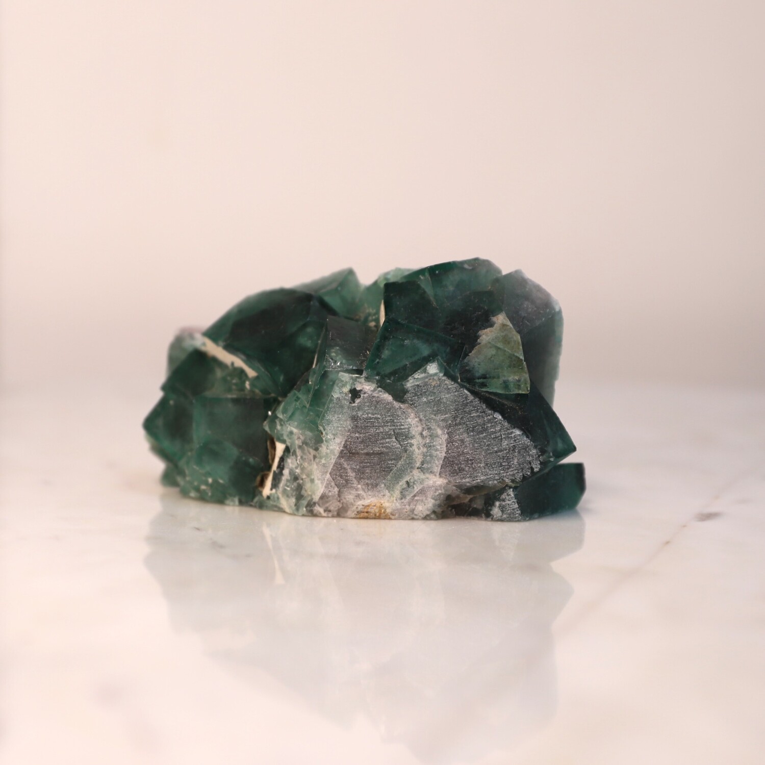 Fluorite crystals formed 150-200 million years ago when hot water containing fluorine and other minerals were forced up through cracks in the earth where it interacted with the calcium – rich limestone bedrock.