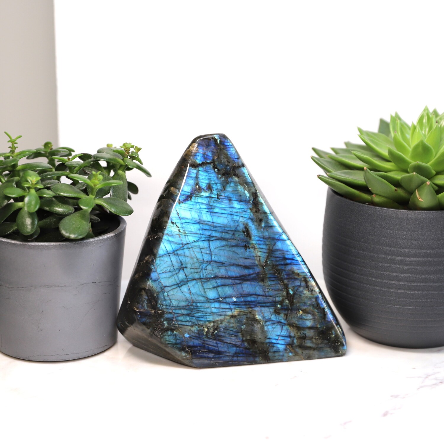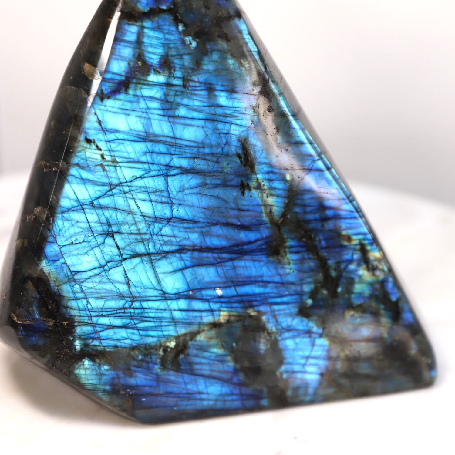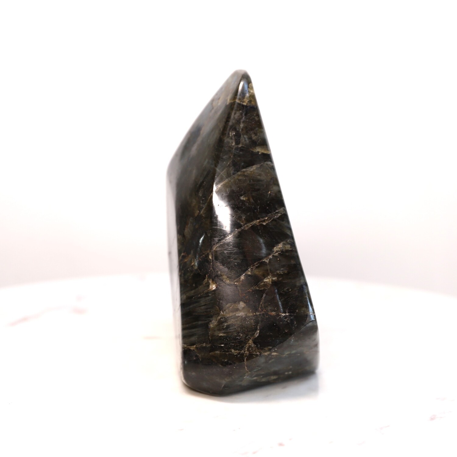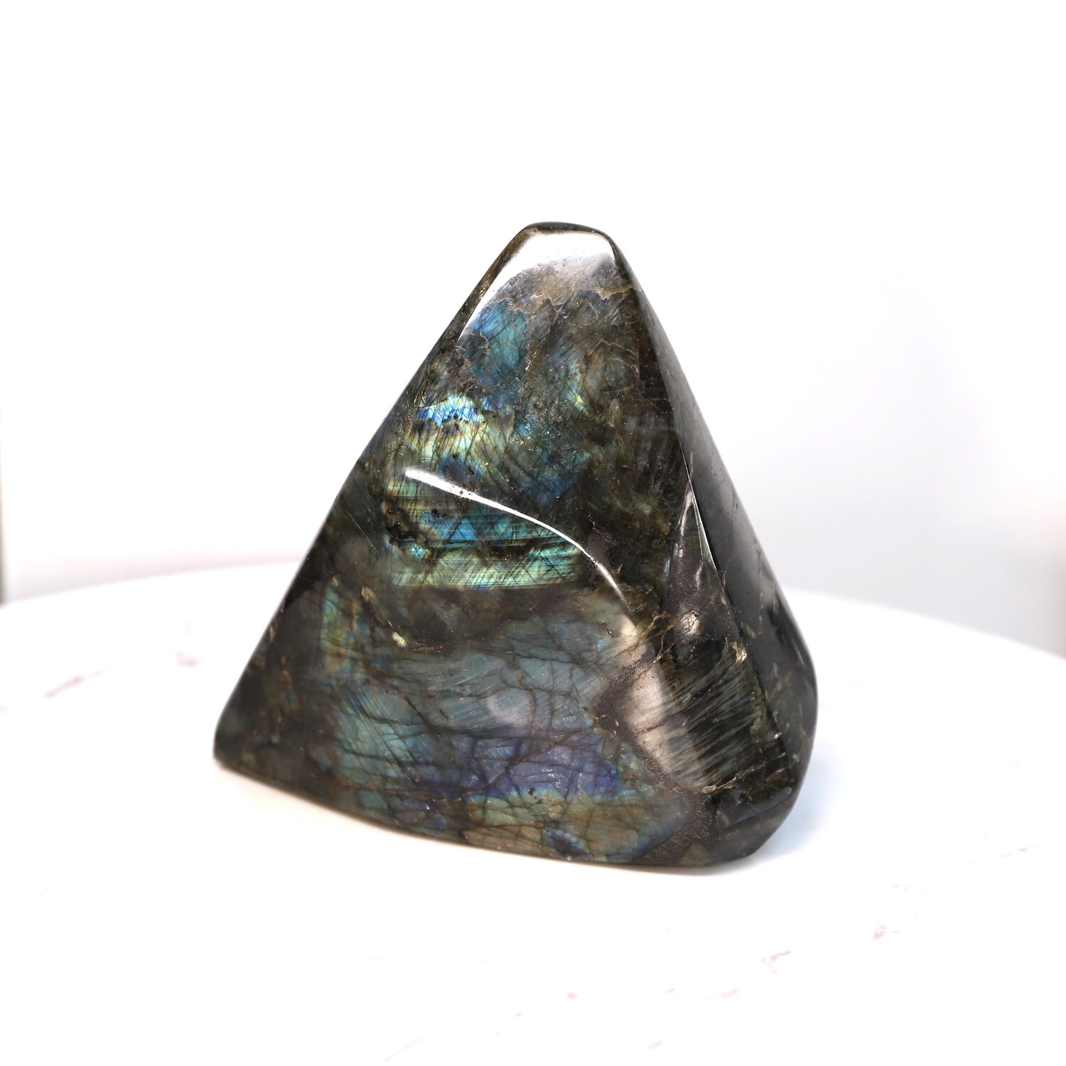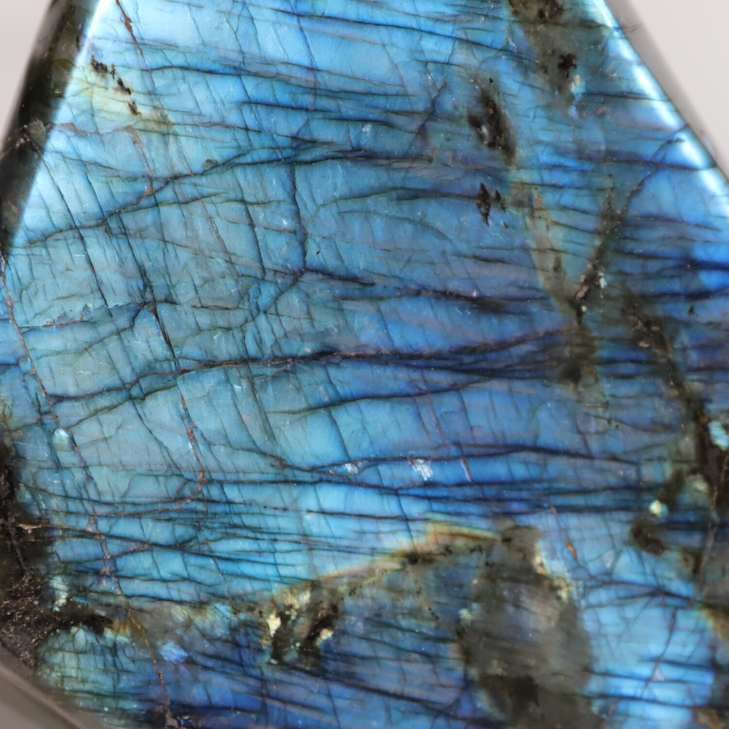 Labradorite appears in various forms, in polished and un-polished finishes. It can display an iridescent effect in the light (Schiller). The price of Labradorite can vary. Its value increases according to the frequency and brightness of flashing, shimmering colours which reflect on the sides when light is directed at it. The flashes of colour can be iridescent blue, golden, lilac, pink, orange, red and grey. Not all pieces of Labradorite have a ‘Shiller’ effect after being polished. Some only have a couple of different colours scattered across the sides. The rarest pieces have a very distinct rainbow-coloured effects known as ‘Labradorescence’.