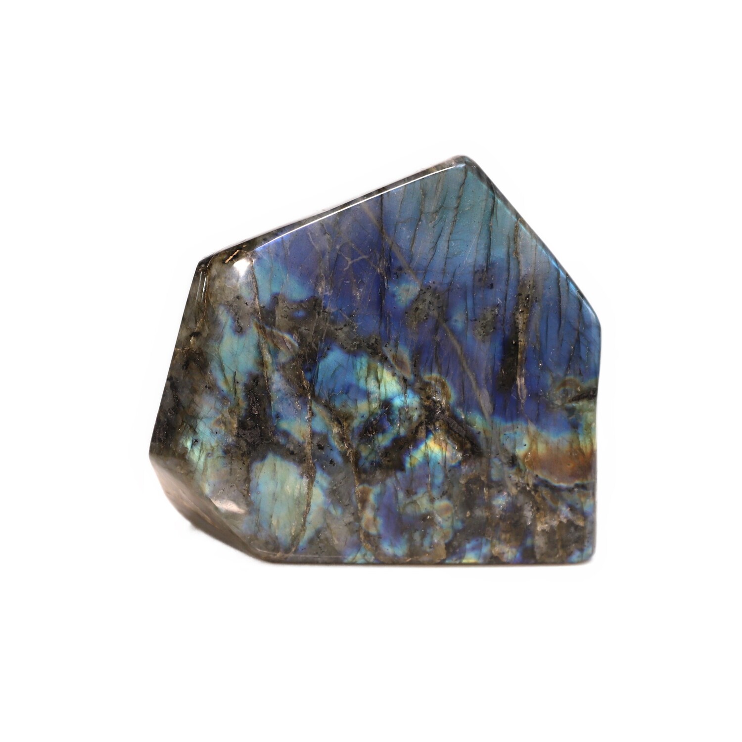 Labradorite appears in various forms, in polished and un-polished finishes. It can display an iridescent effect in the light (Schiller). The price of Labradorite can vary. Its value increases according to the frequency and brightness of flashing, shimmering colours which reflect on the sides when light is directed at it. The flashes of colour can be iridescent blue, golden, lilac, pink, orange, red and grey. Not all pieces of Labradorite have a ‘Shiller’ effect after being polished. Some only have a couple of different colours scattered across the sides. The rarest pieces have a very distinct rainbow-coloured effects known as ‘Labradorescence’.