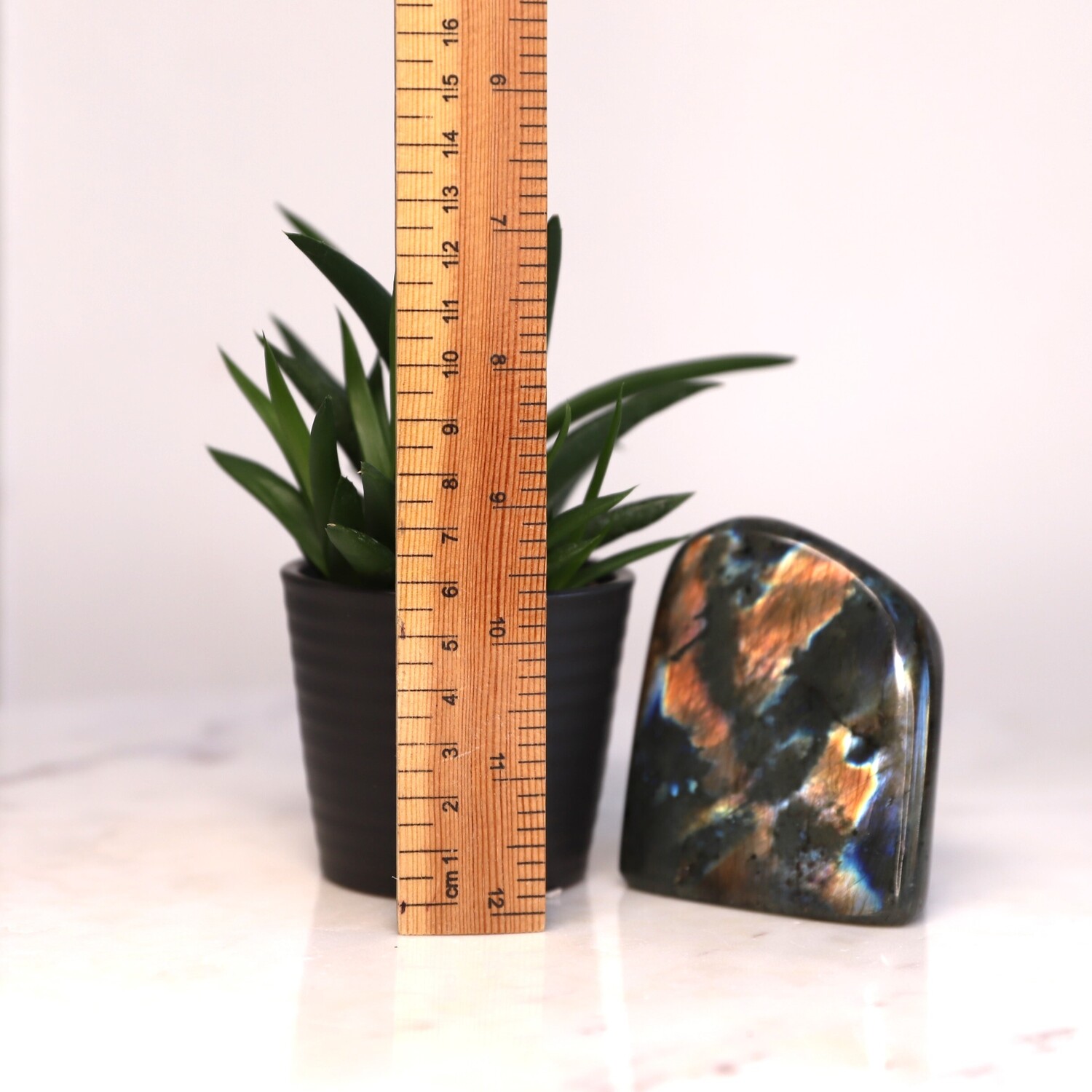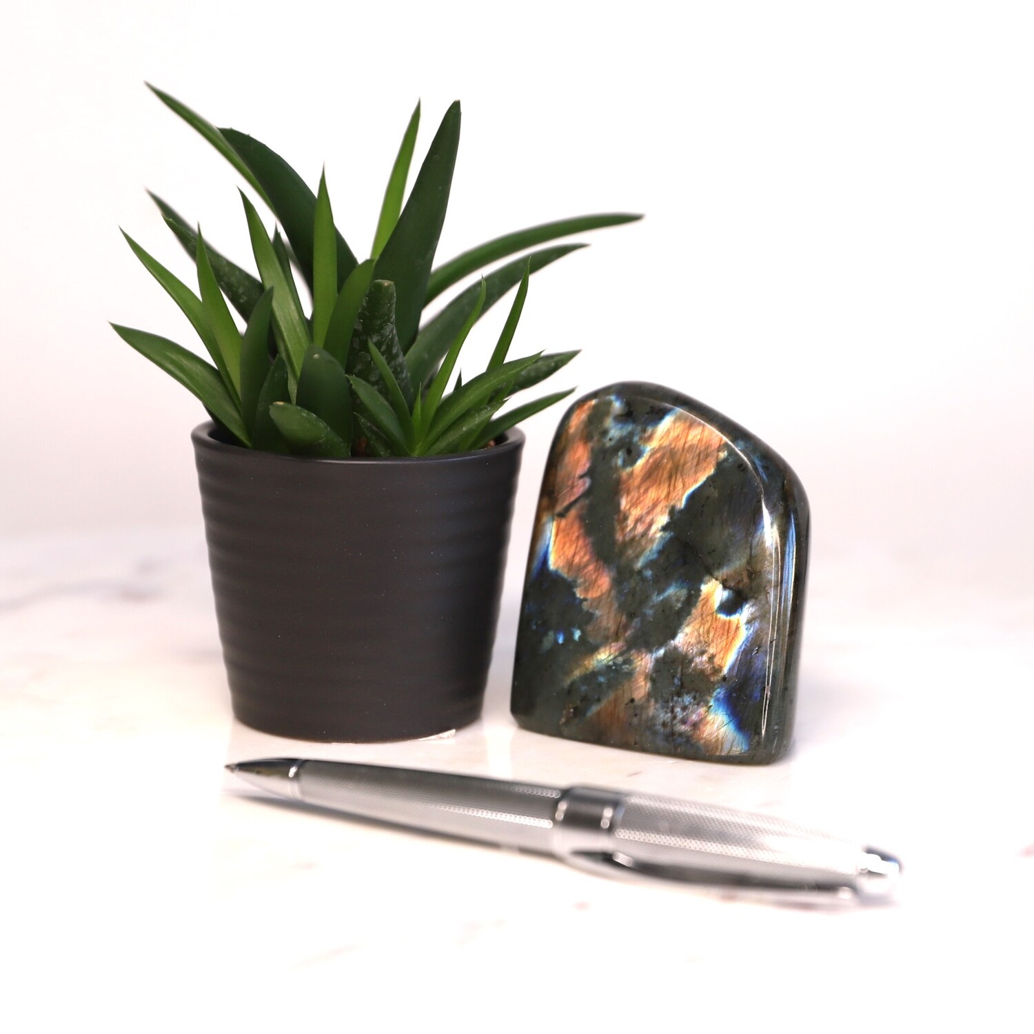 Labradorite appears in various forms, in polished and un-polished finishes. It can display an iridescent effect in the light (Schiller). The price of Labradorite can vary. Its value increases according to the frequency and brightness of flashing, shimmering colours which reflect on the sides when light is directed at it. The flashes of colour can be iridescent blue, golden, lilac, pink, orange, red and grey. Not all pieces of Labradorite have a ‘Shiller’ effect after being polished. Some only have a couple of different colours scattered across the sides. The rarest pieces have a very distinct rainbow-coloured effects known as ‘Labradorescence’.