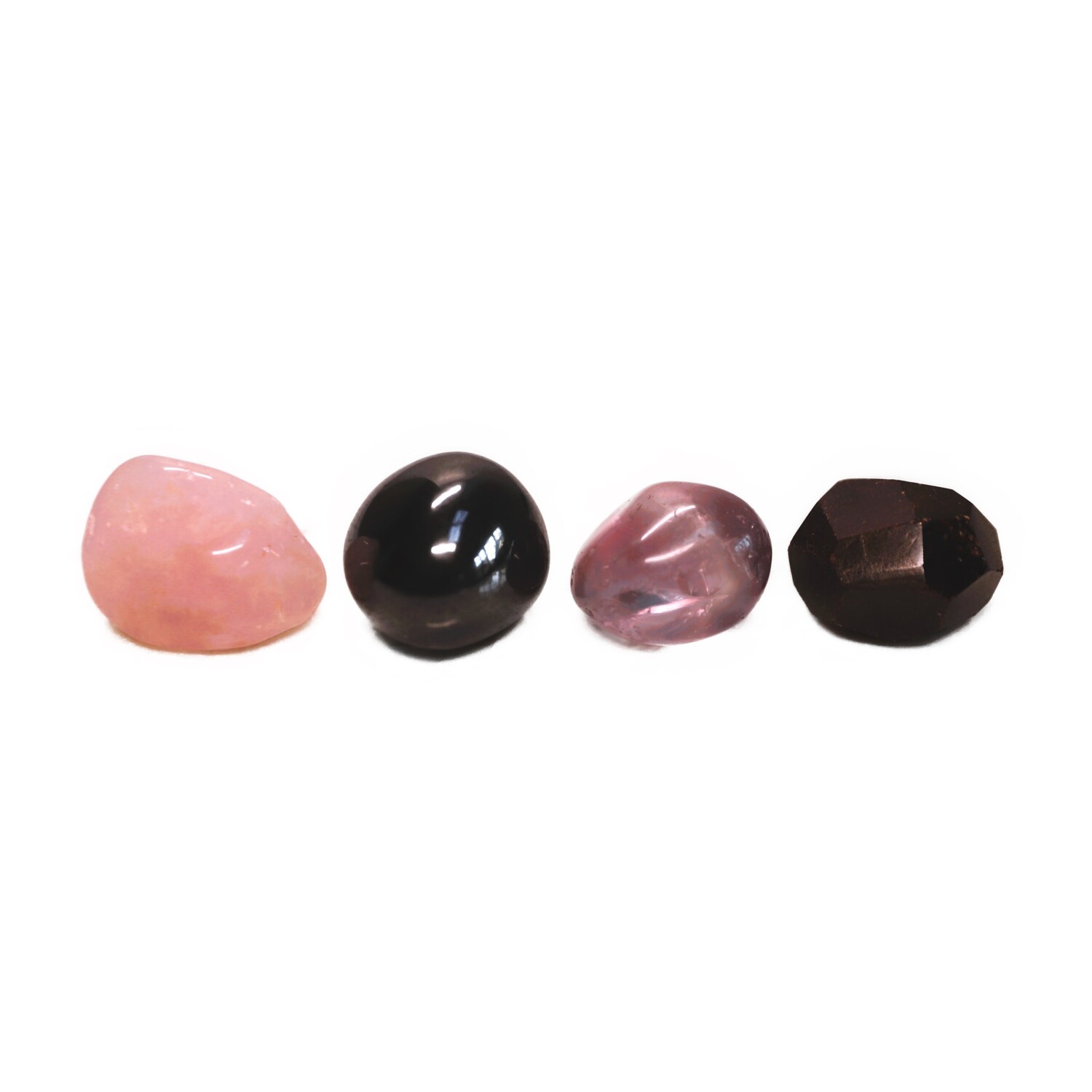 4 Large Crystals: 1 x Alamandine Faceted Garnet, 1 x Rose Quartz Large Tumble Stone, 1 x Hematite Large Tumble Stone, 1 x Amethyst Large Tumble Stone.