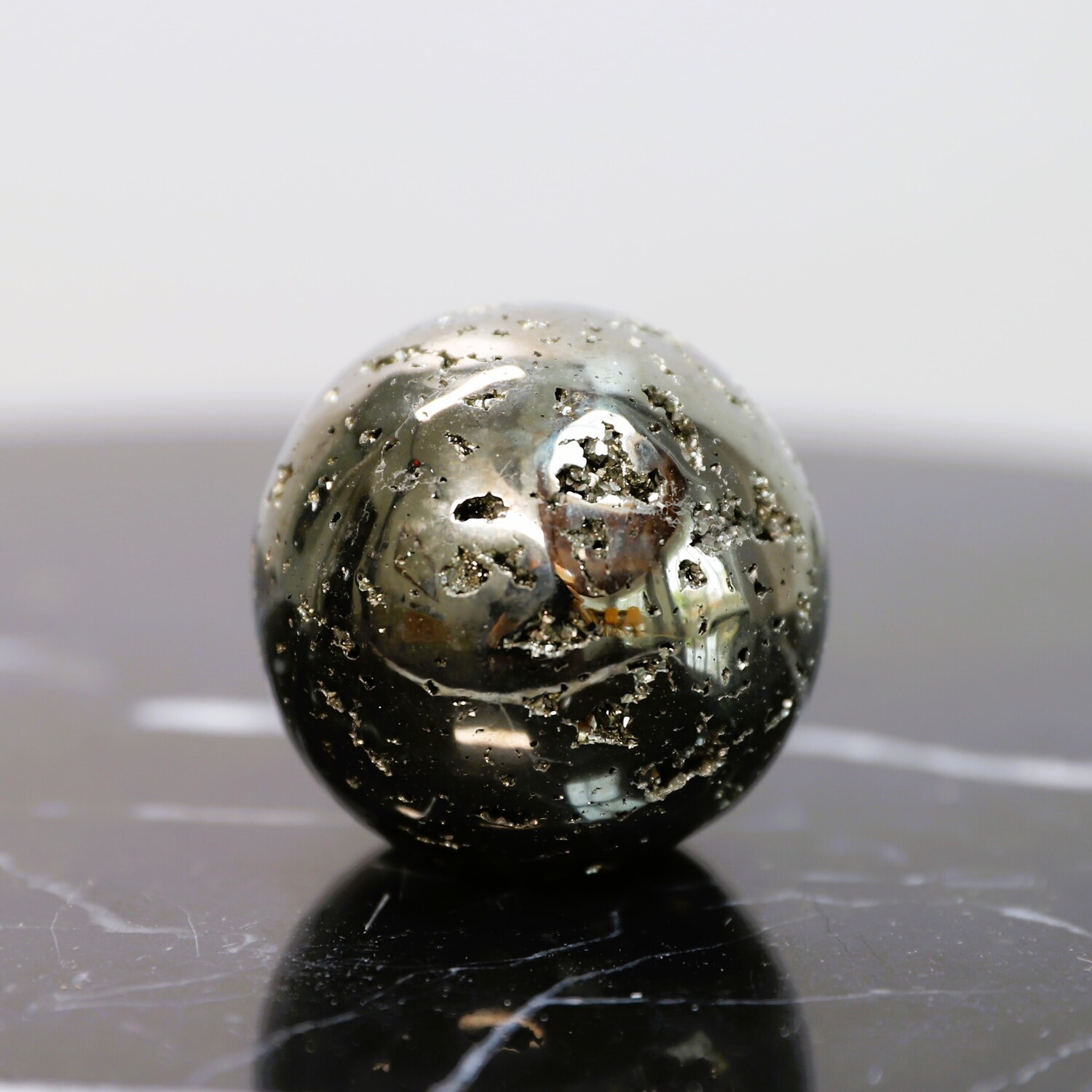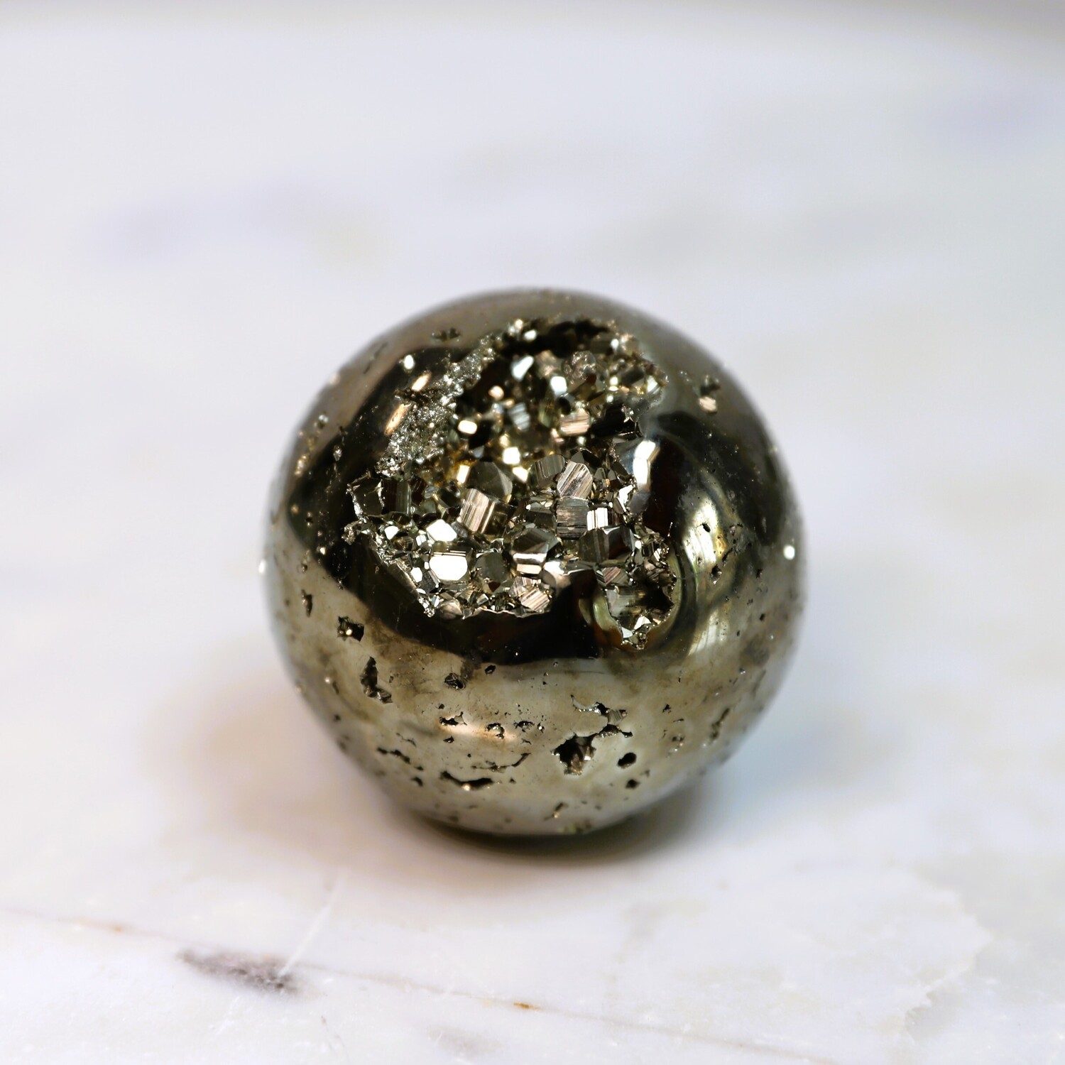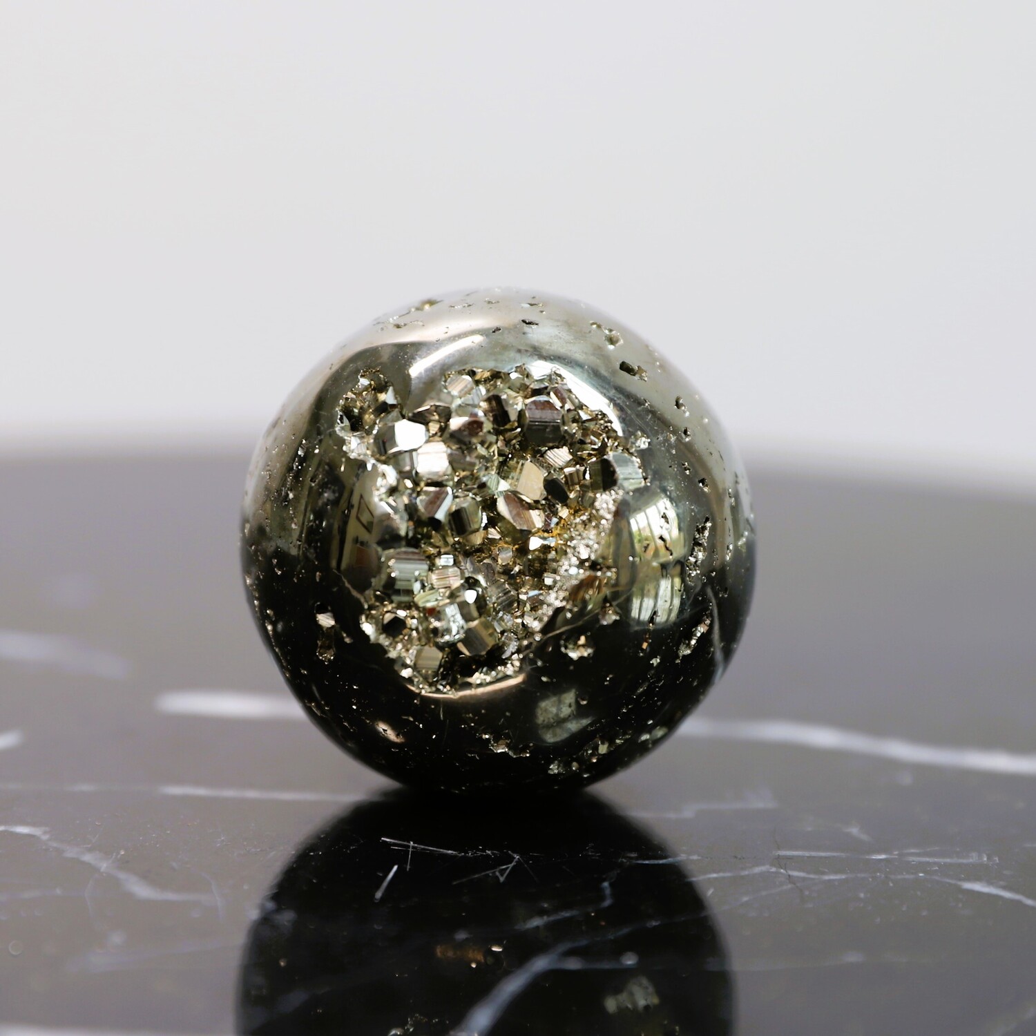 1 Pyrite polished sphere in lovely shades of gold. Beautiful druzie cubes in areas.