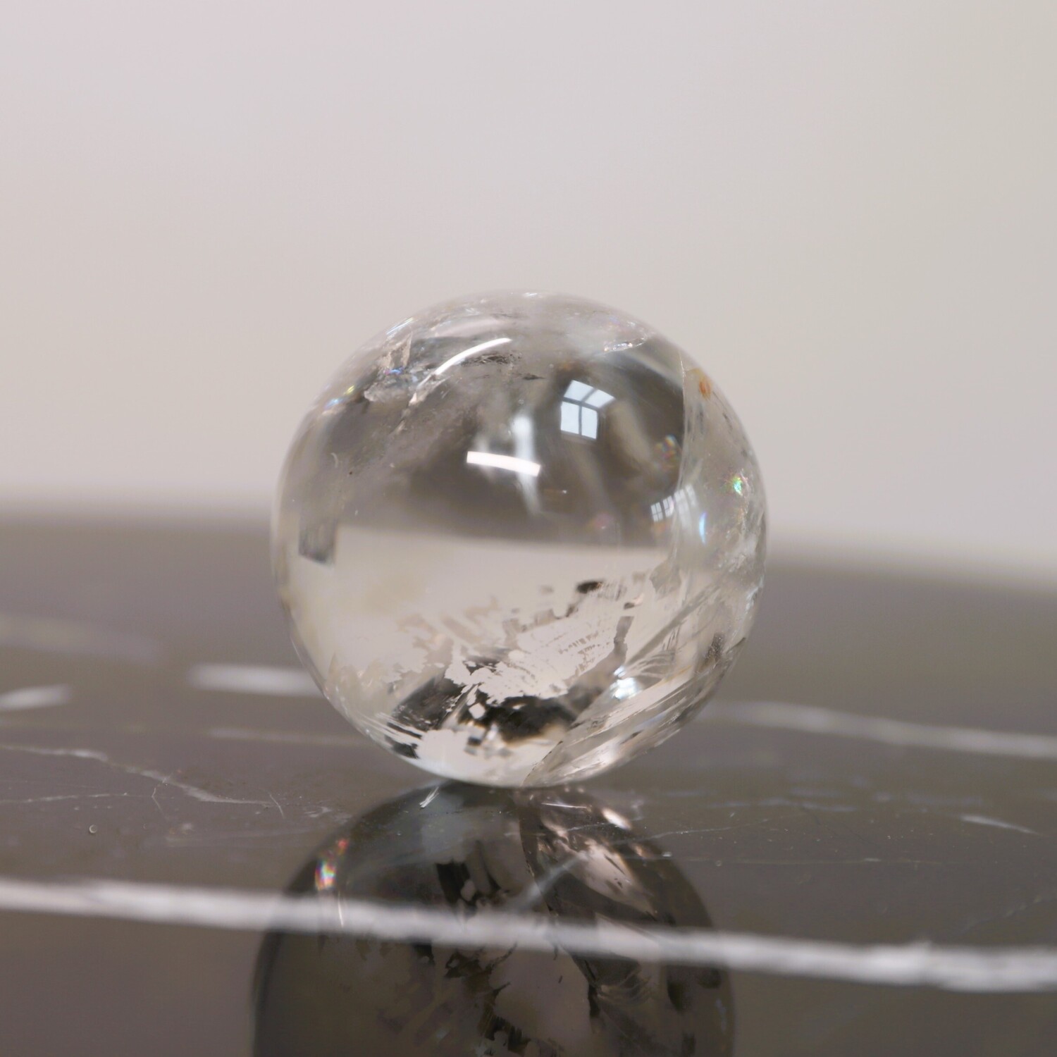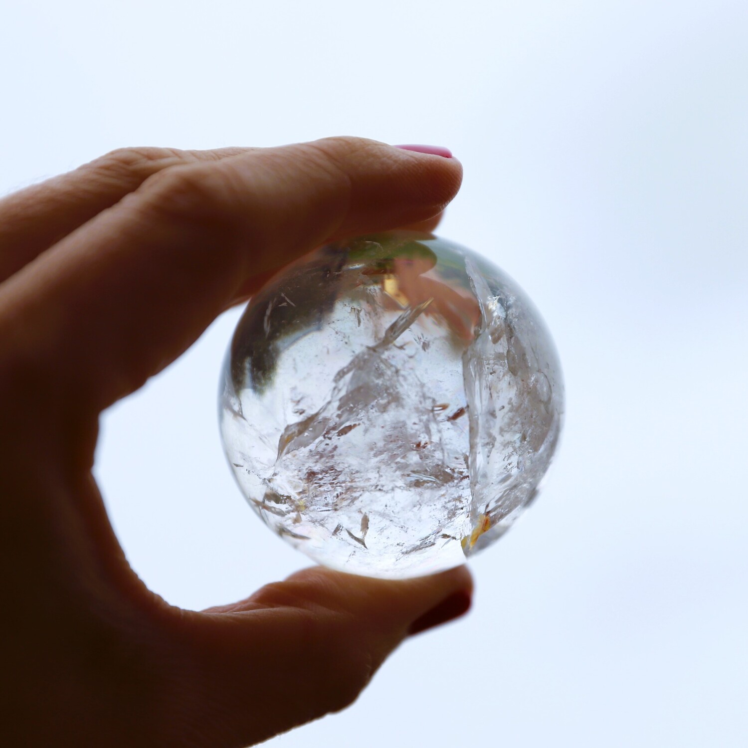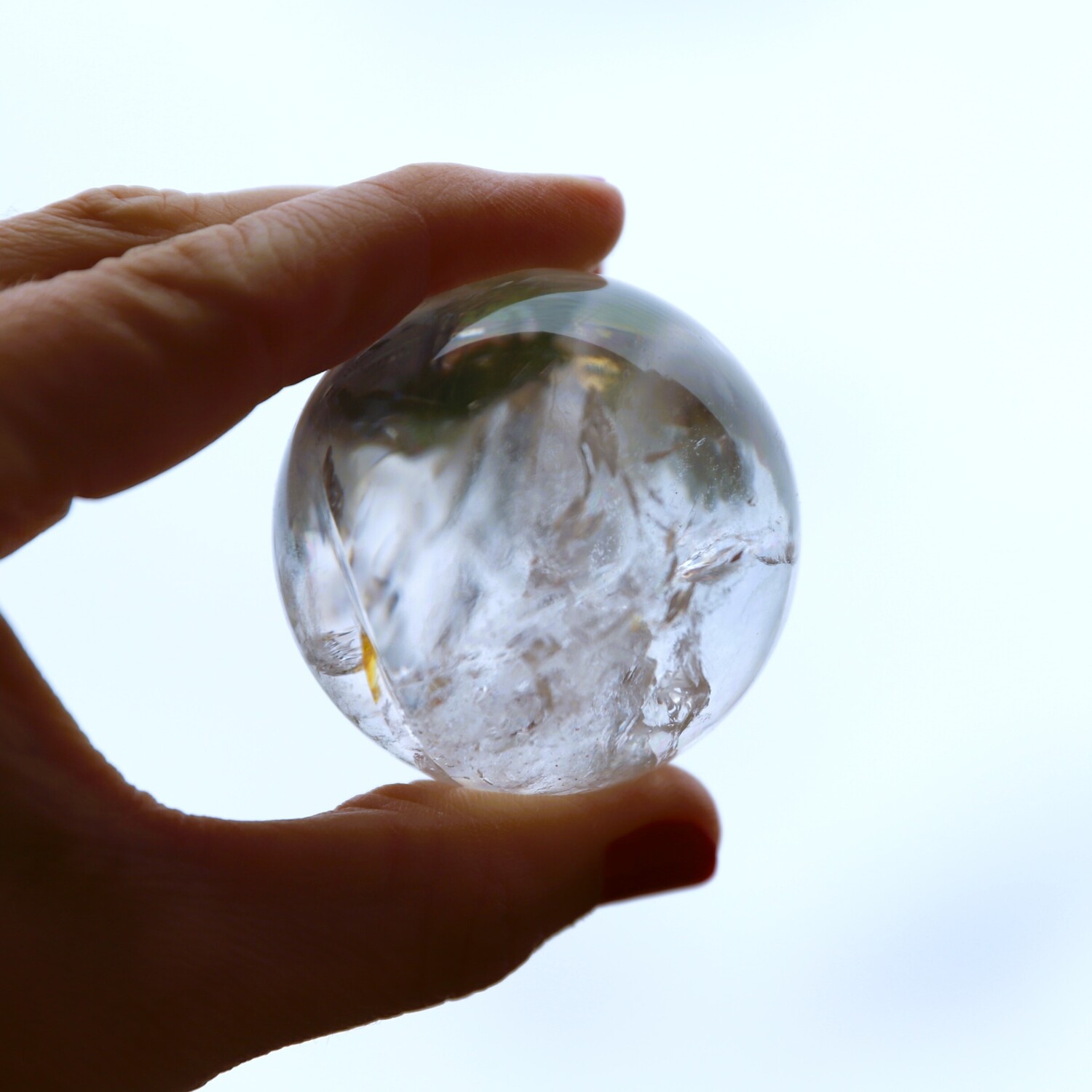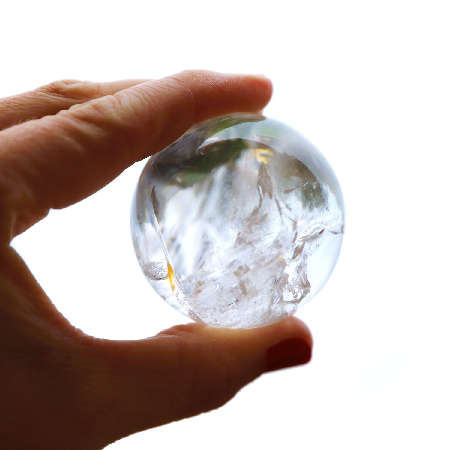 1 Lemurian Quartz polished sphere with amazing water clarity & inclusions. Beautiful rainbow colours when held in the light.
