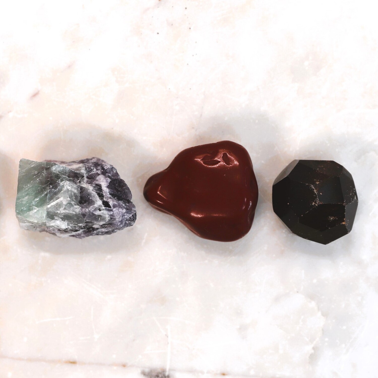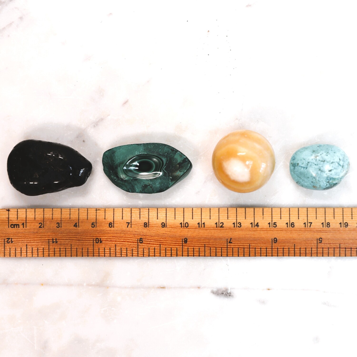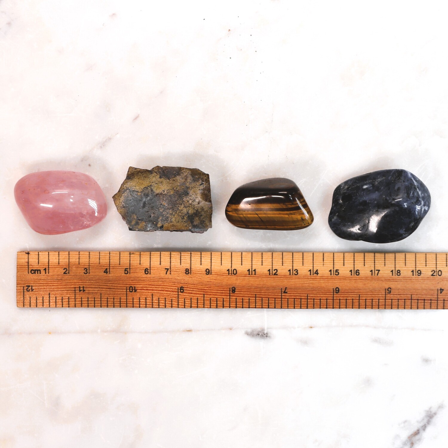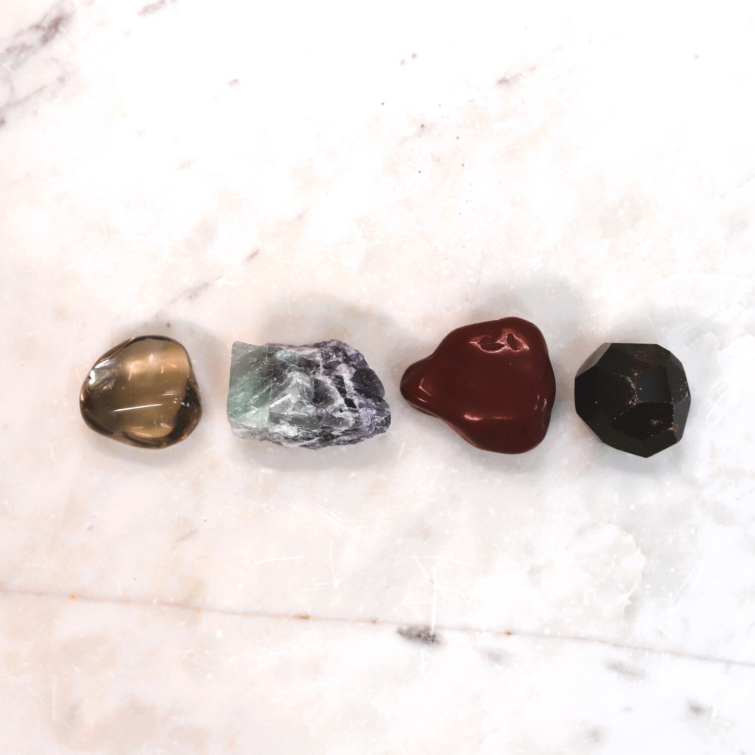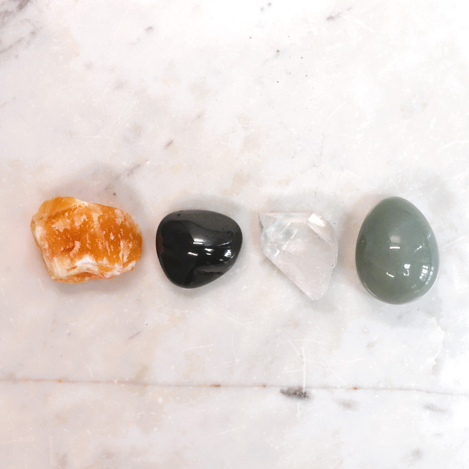 16 unique hand selected crystals: 1 x Rose Quartz tumble stone, 1 x Amethyst cluster, 1 x Quartz natural point, 1 x Tigers Eye tumble stone, 1 x Black Tourmaline tumble stone, 1 x Fluorite raw natural piece, 1 x Garnet natural piece, 1 x Red Jasper tumble stone, 1 x Aventurine egg shape, 1 x Smoky Quartz tumble stone, 1 x Malachite polished piece, 1 x Orange Calcite hand polished Sphere, 1 x Chrysocolla tumble stone, 1 x Sodalite tumble stone, 1 x Orange Calcite raw natural piece, 1 x Hematite tumble stone.