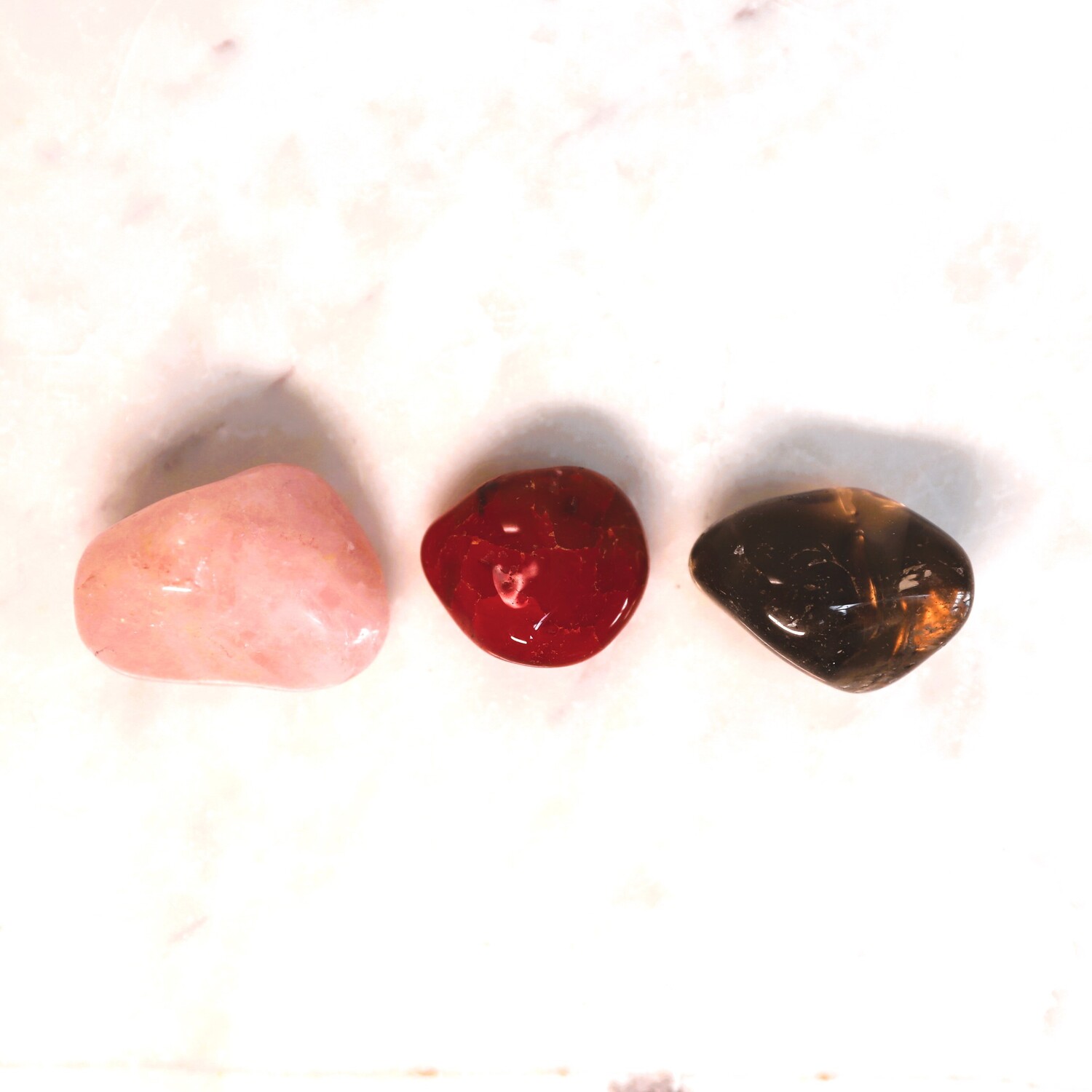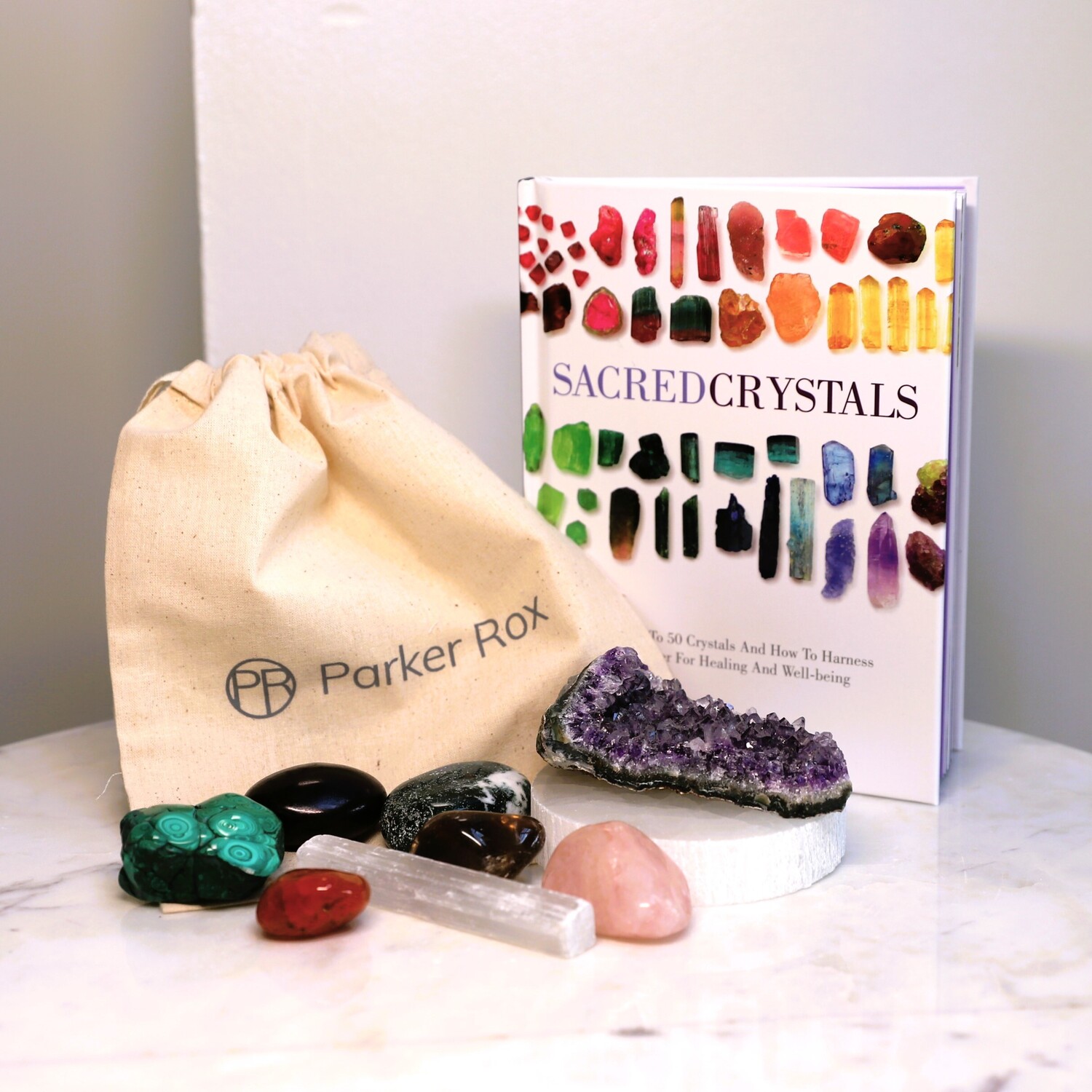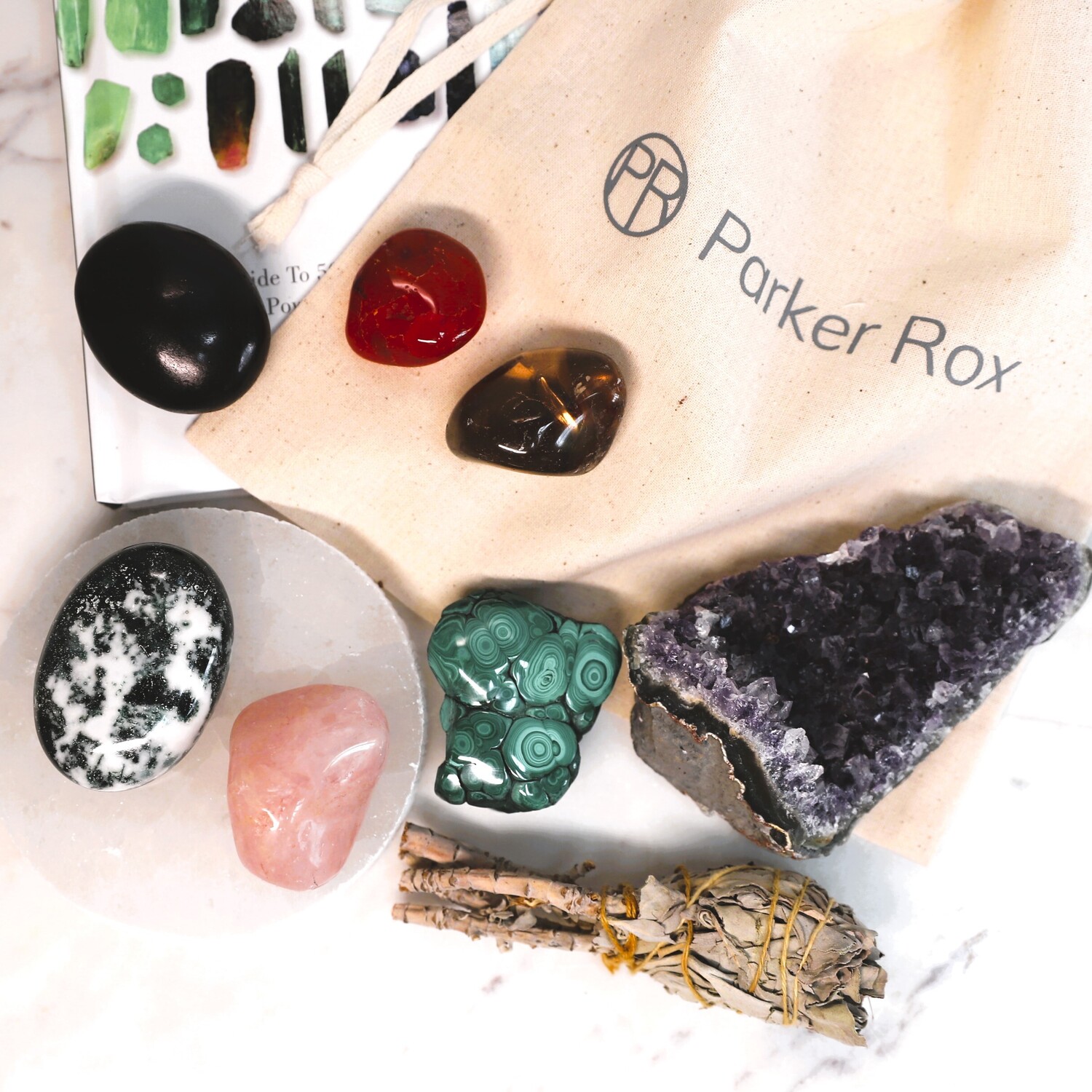9 Crystals: 1 x Black Tourmaline palm stone, 1 x Green Moss Agate palm stone, 1 x Carnelian tumble stone, 1 x Rose Quartz tumble stone, 1 x Smoky Quartz tumble stone, 1 x Malachite free-form piece, 1 x Selenite charging plate, 1 x Amethyst Cluster, 1 x Selenite rod.