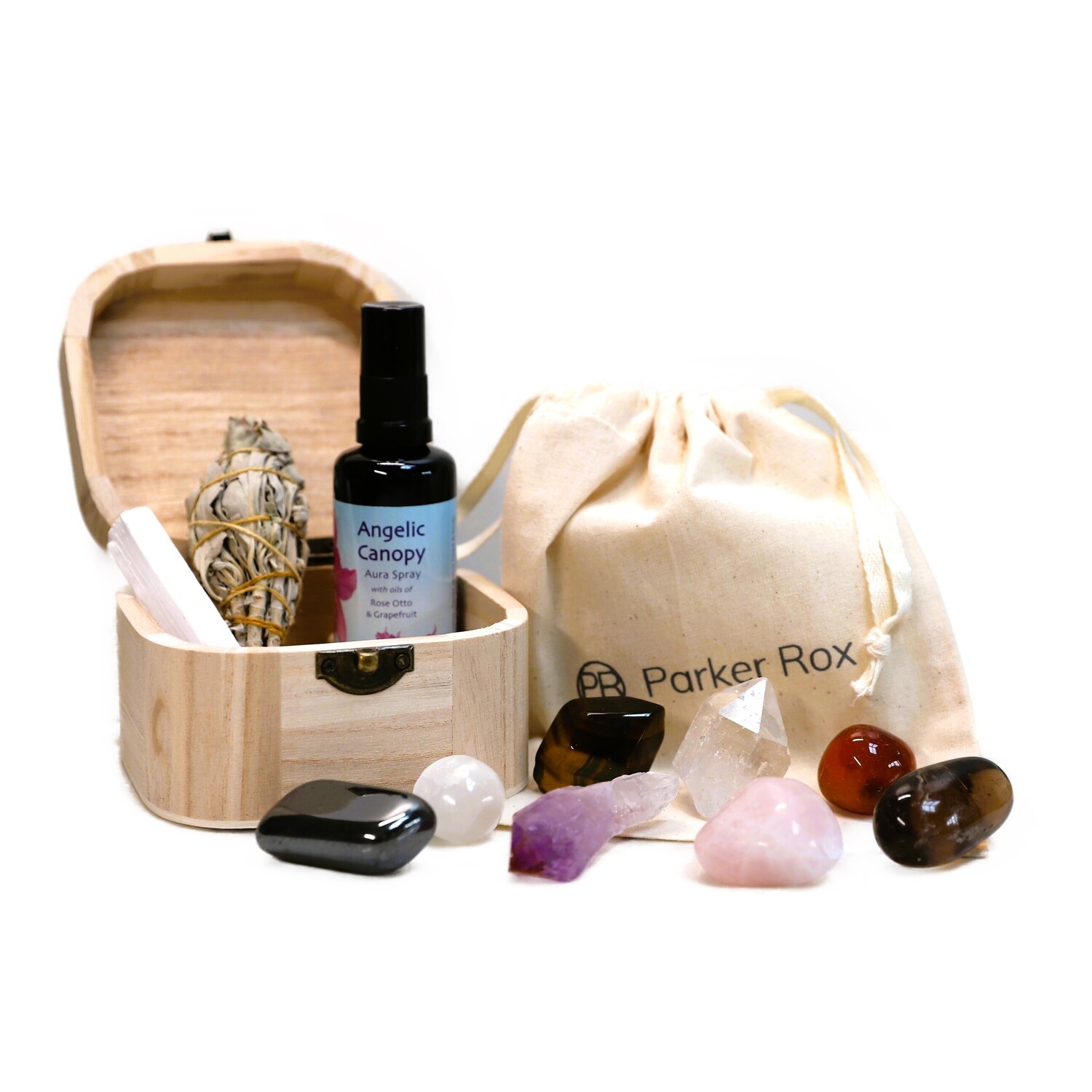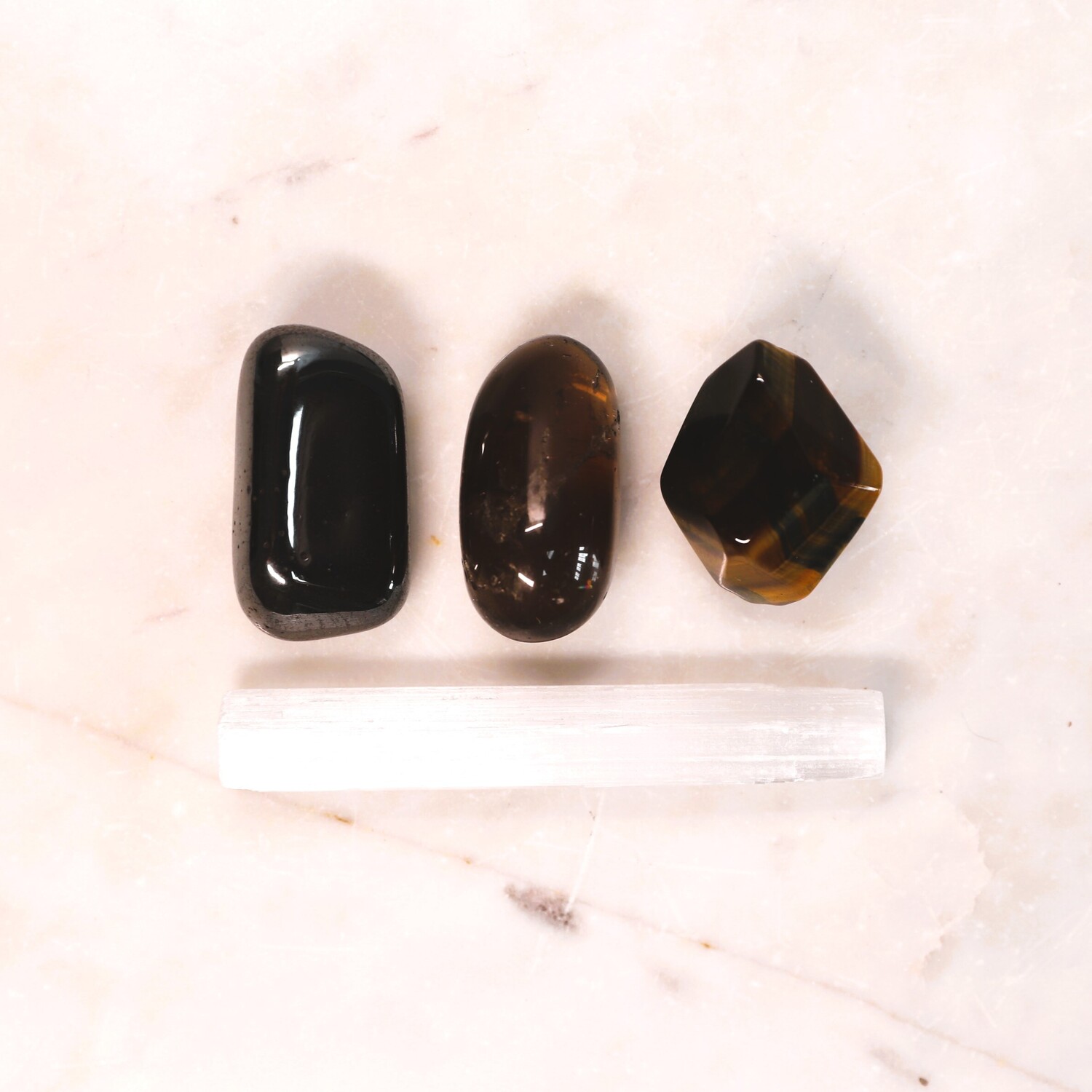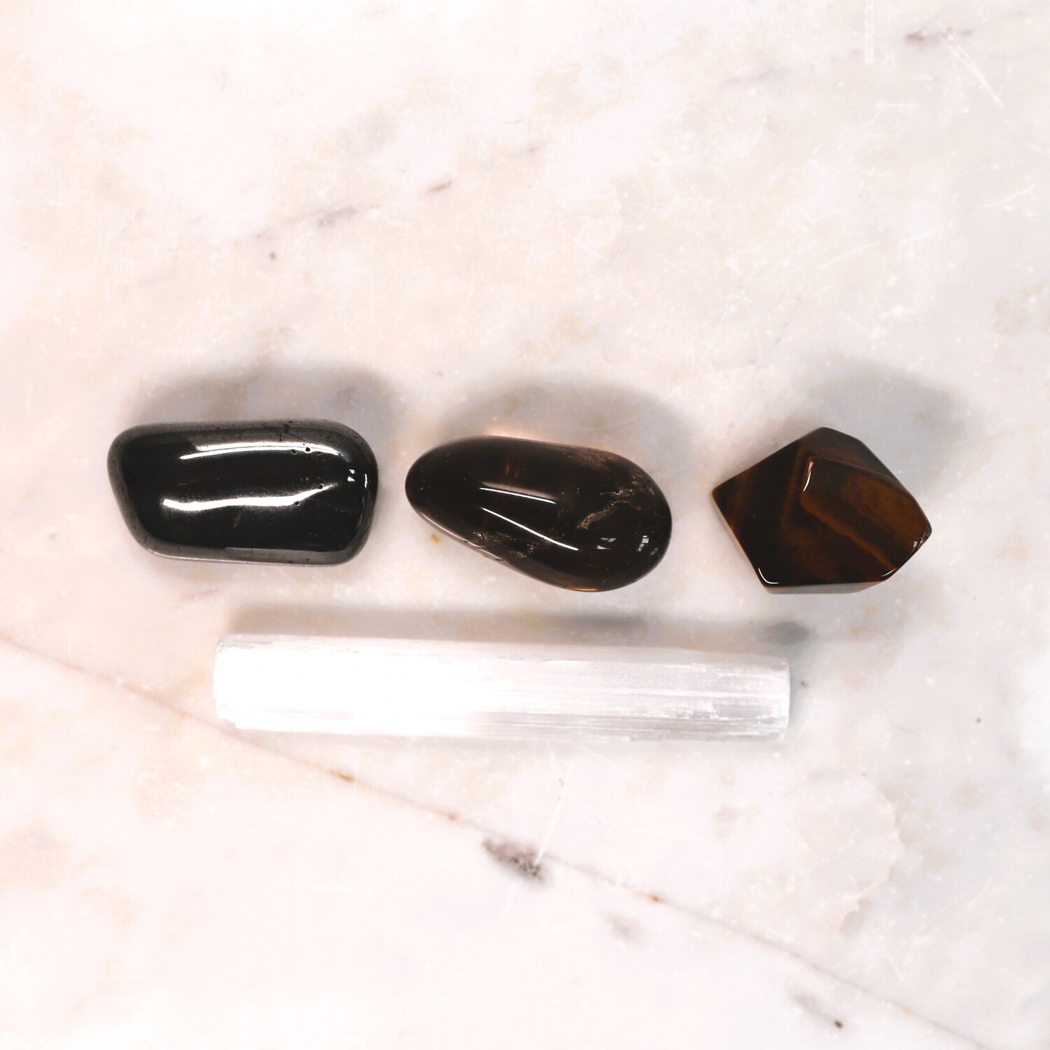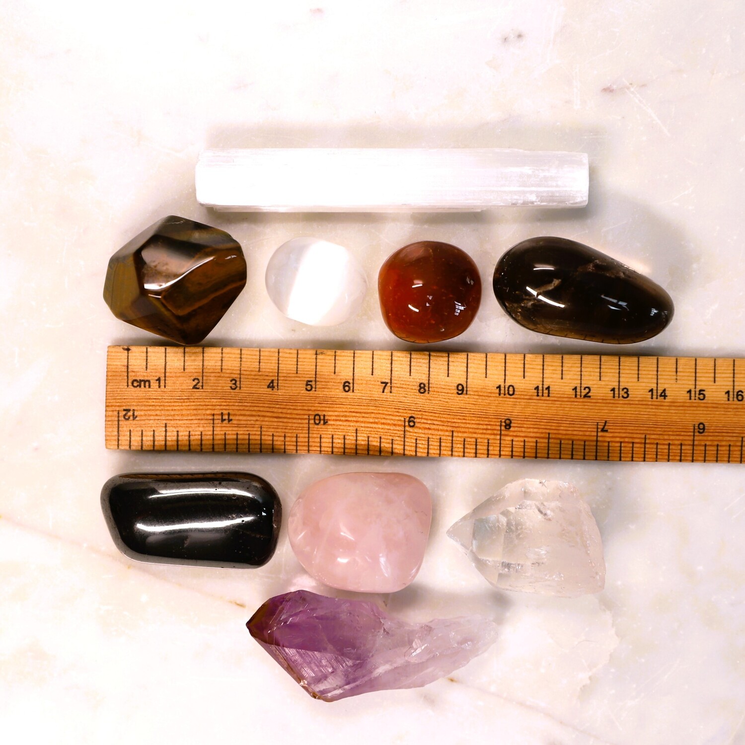 1 x Natural Quartz Point, 1 x Hematite tumble stone, 1 x Smoky Quartz tumble stone, 1 x Rose Quartz tumble stone, 1 x Carnelian tumble stone, 1 x Selenite Sphere shape.
