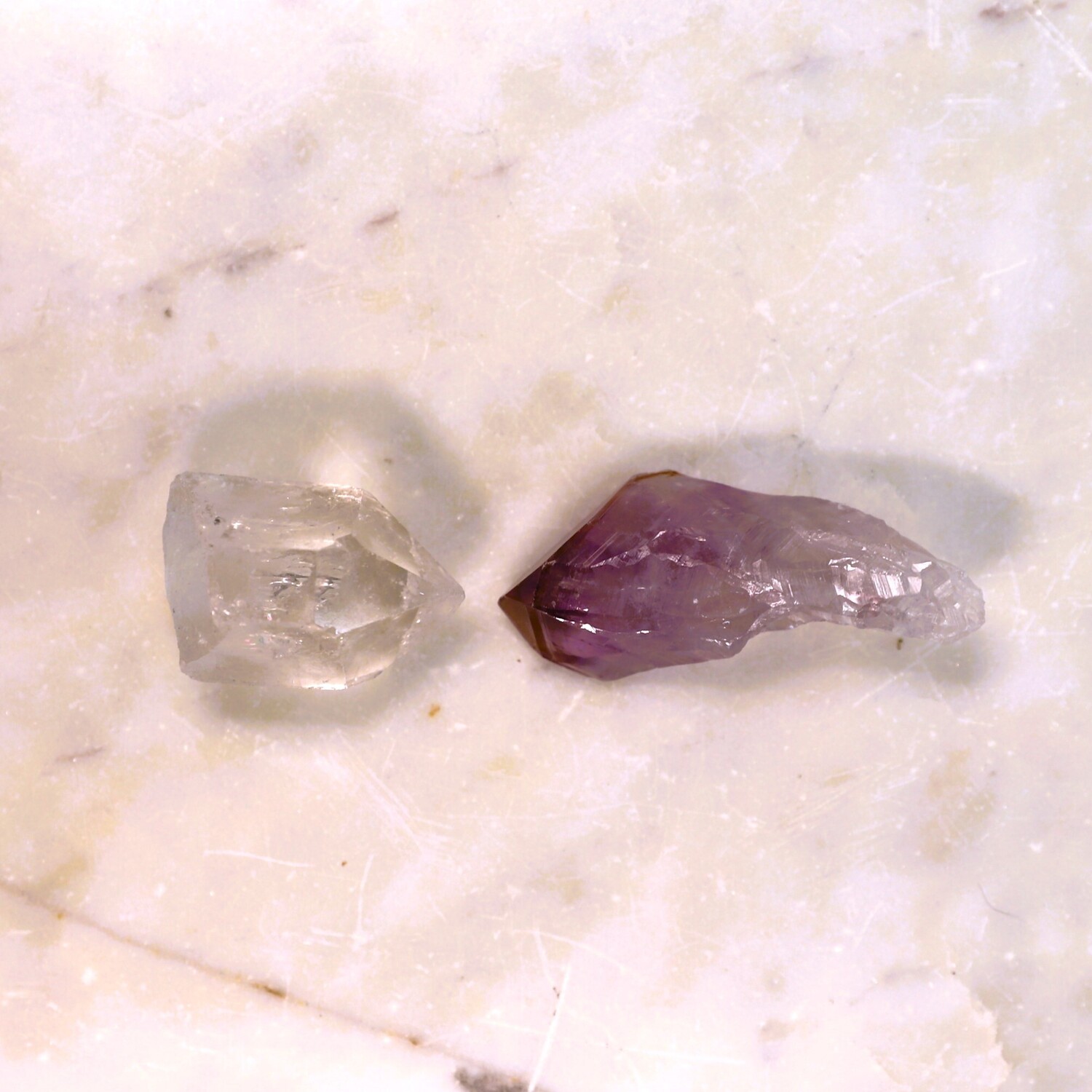 9 crystals: 1 x Faceted Tigers Eye, 1 x Selenite Rod, 1 x Natural Amethyst Point,