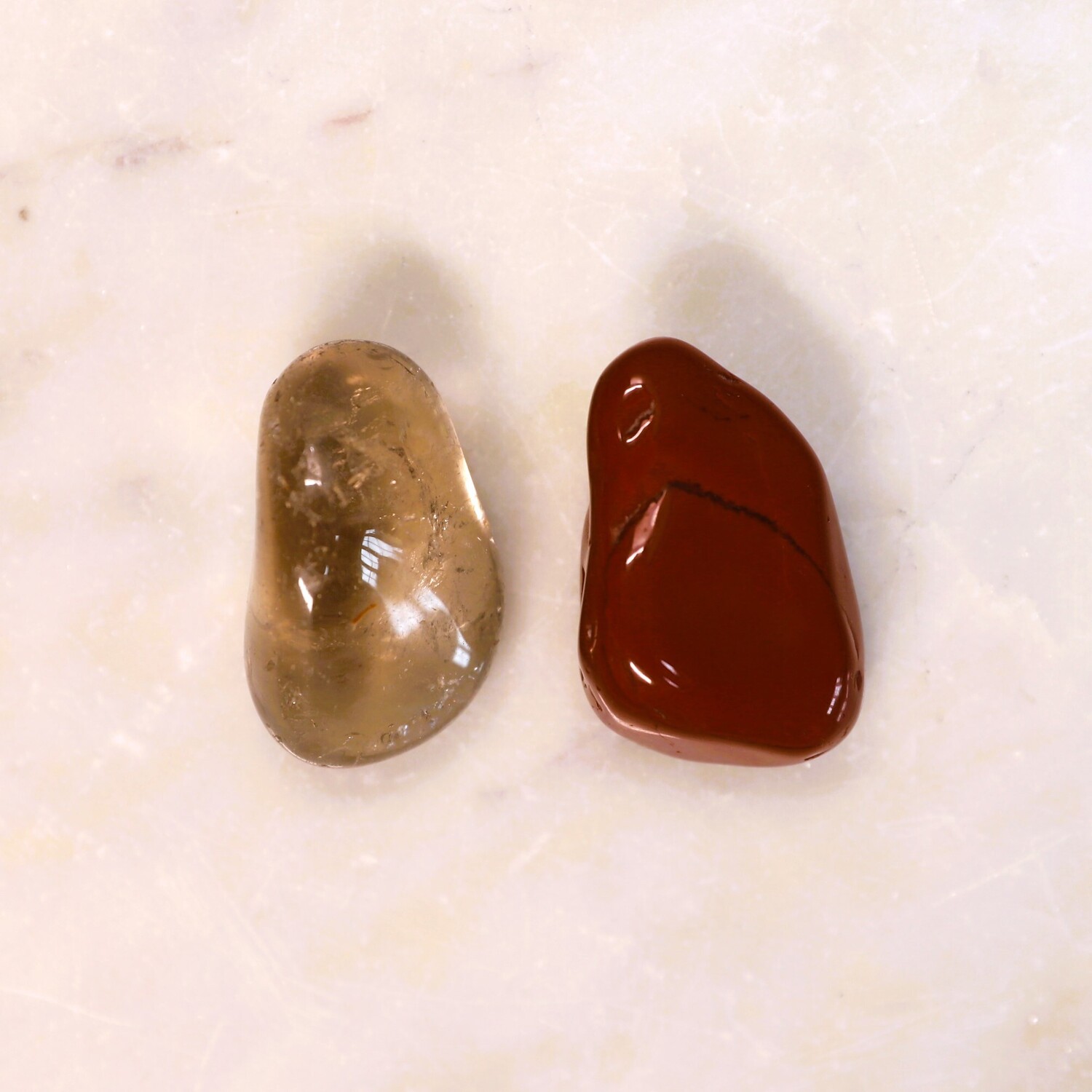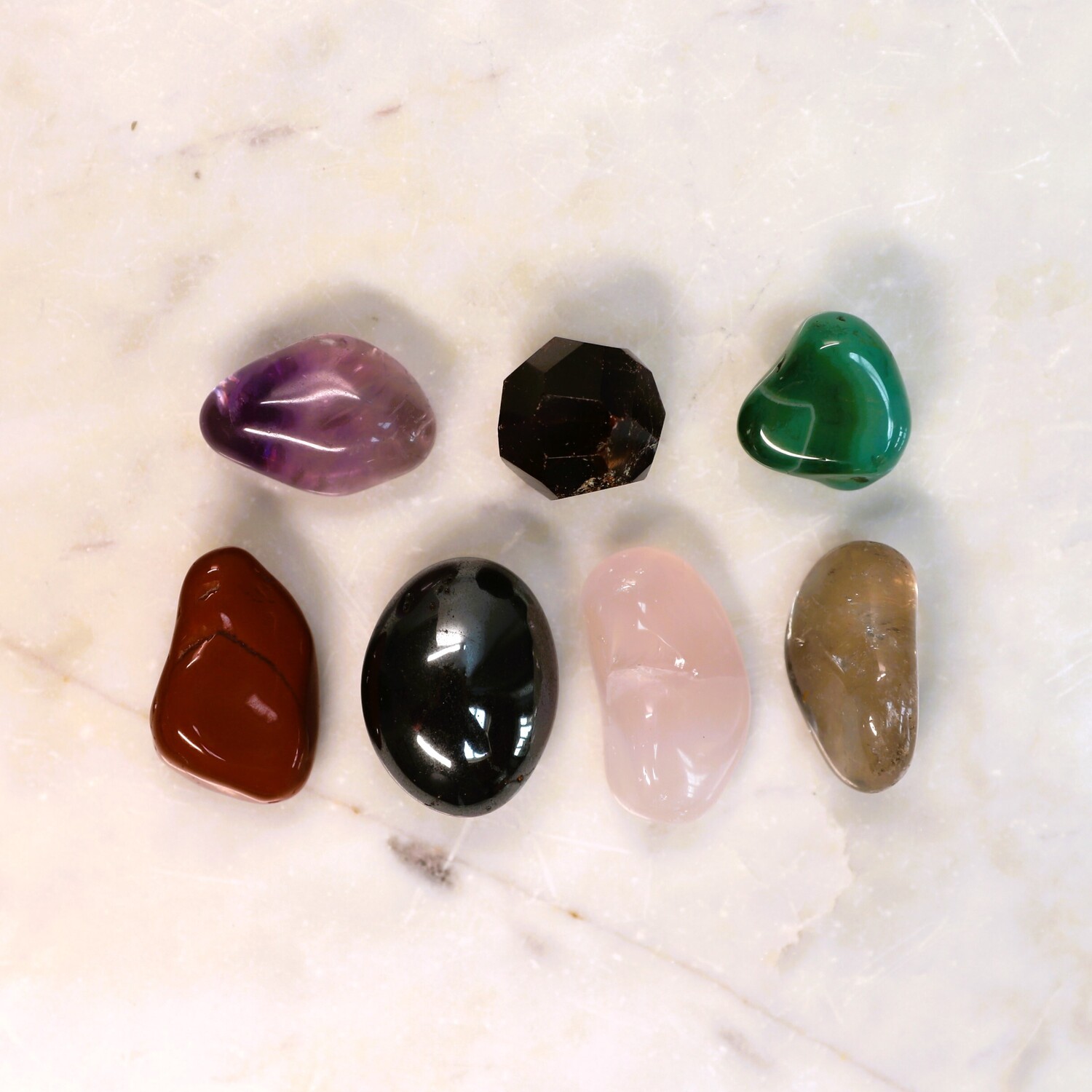 8 Crystals: 1 x Amethyst tumble stone, 1 x Hematite tumble stone, 1 x Red Jasper tumble stone, 1 x Smoky Quartz tumble stone, 1 x Rose Quartz tumble stone, 1 x Garnet faceted piece, 1 x Aventurine tumble stone, 1 Selenite charging plate.