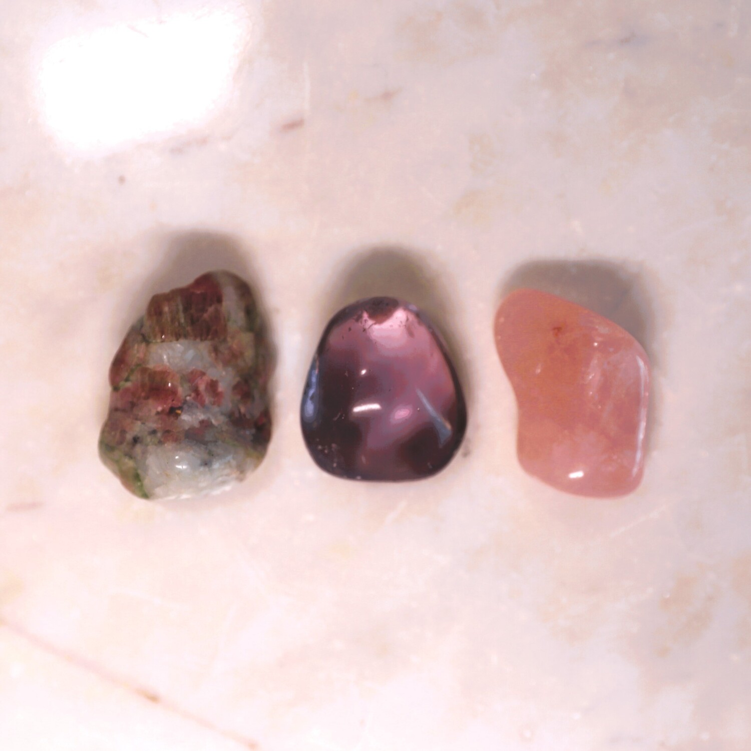 8 crystals: 1 x Water Melon Tourmaline tumble stone, 1 x Amethyst tumble stone, 1 x Faceted Garnet piece, 1 Rose Quartz tumble stone, 1 x Clear Quartz tumble stone, 1 x Lapis Lazuli tumble stone, 1 x Selenite rod, 1 x Selenite charging plate,