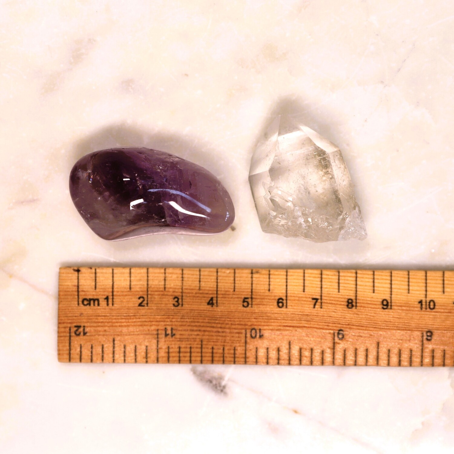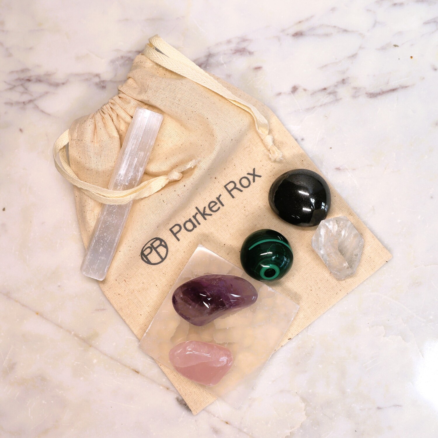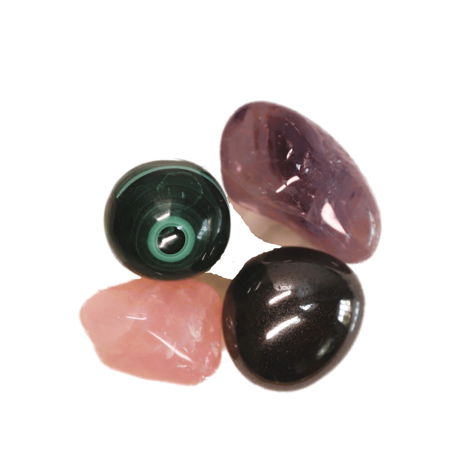 7 Crystals: 1 x Hematite tumble stone, 1 x Rose Quartz tumble stone, 1 x Amethyst tumble stone, 1 x Malachite Sphere, 1 x Natural Quartz point, 1 x Selenite rod, 1 x Selenite Charging plate.