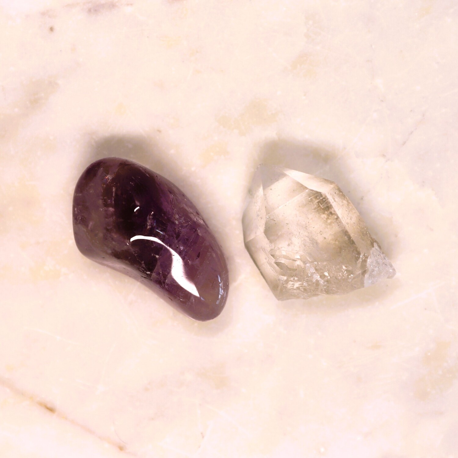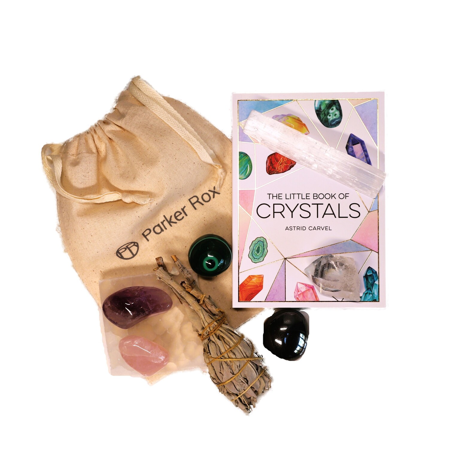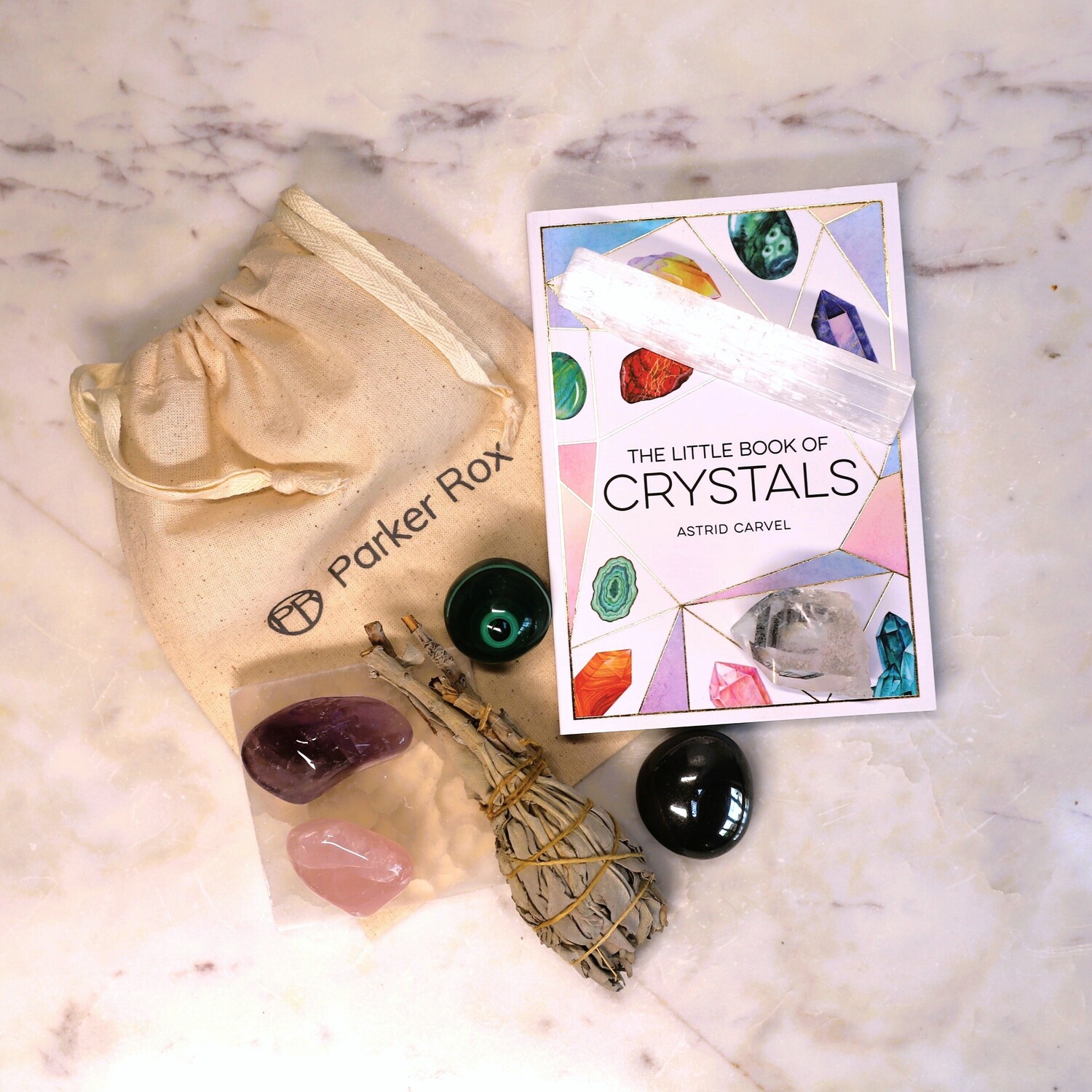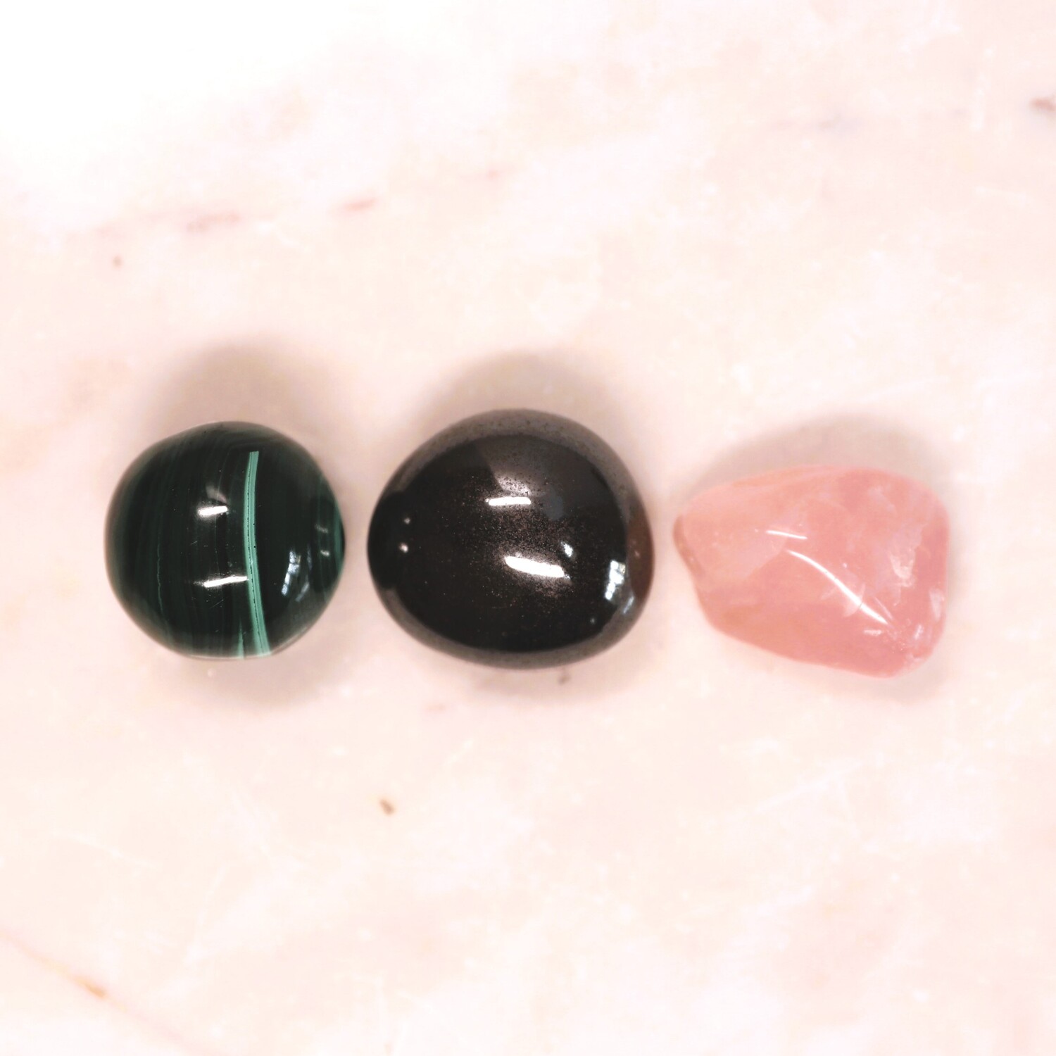 7 Crystals: 1 x Hematite tumble stone, 1 x Rose Quartz tumble stone, 1 x Amethyst tumble stone, 1 x Malachite Sphere, 1 x Natural Quartz point, 1 x Selenite rod, 1 x Selenite Charging plate.