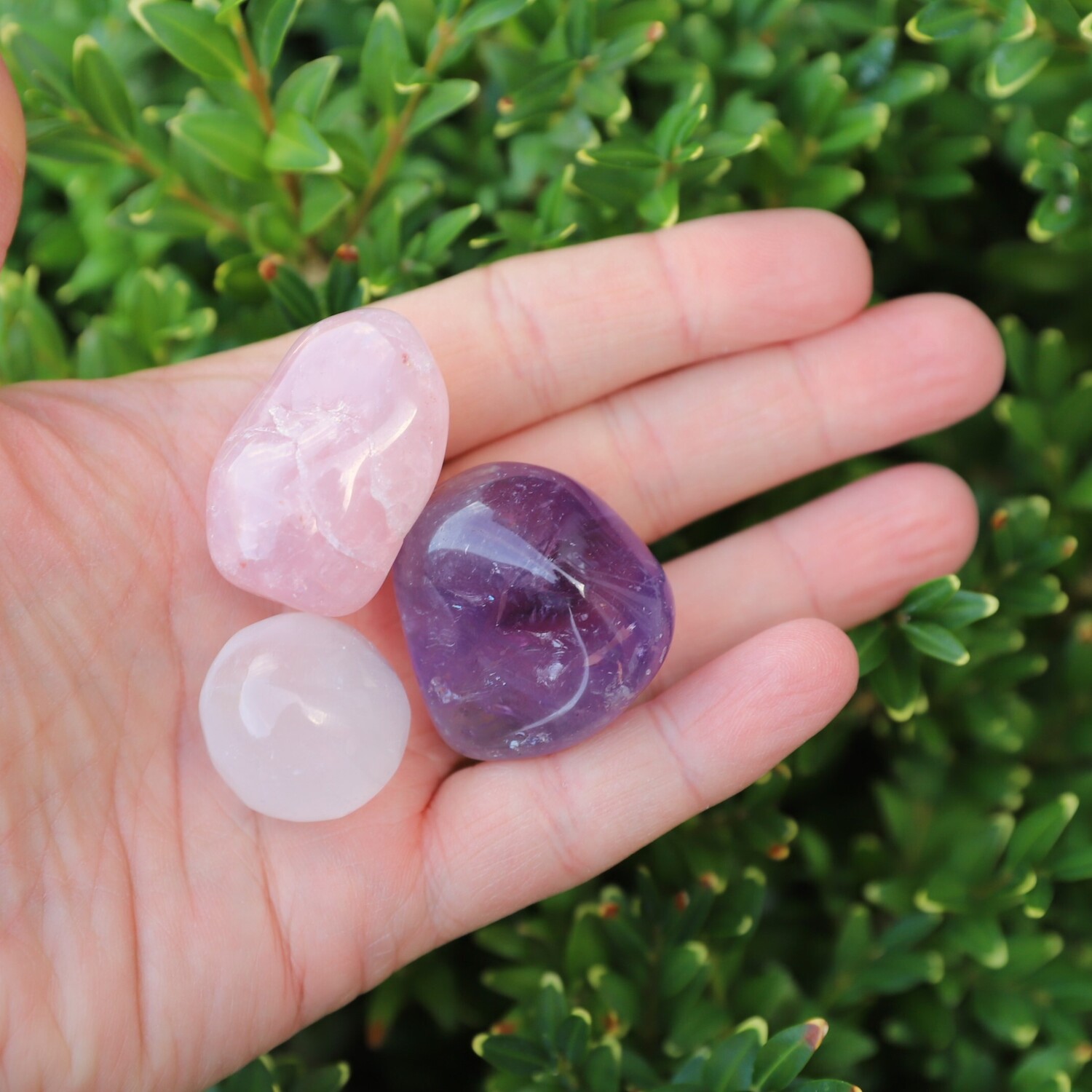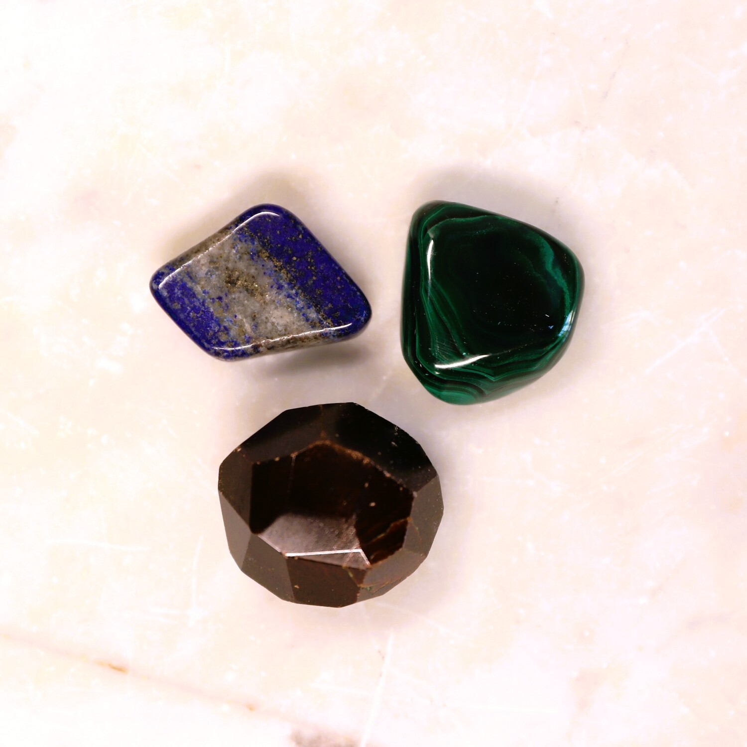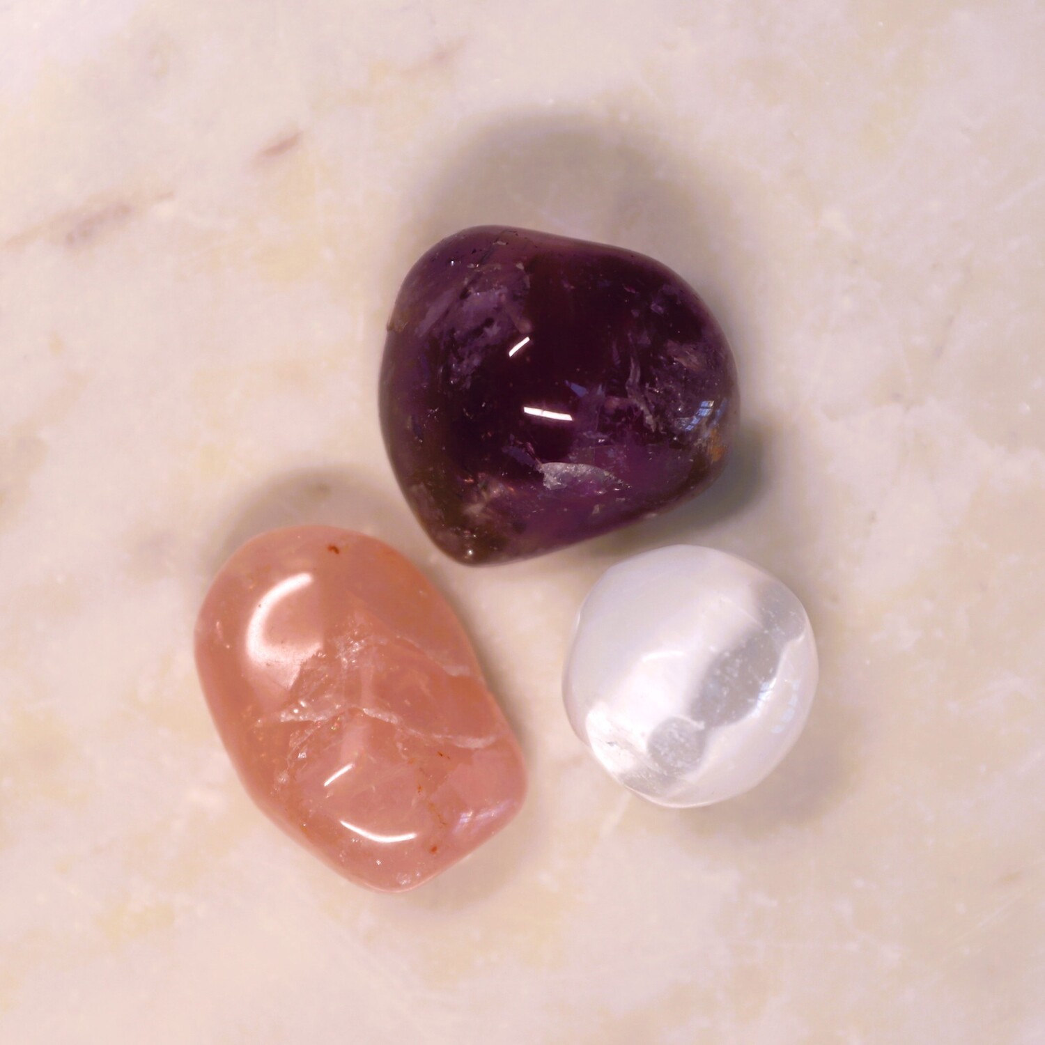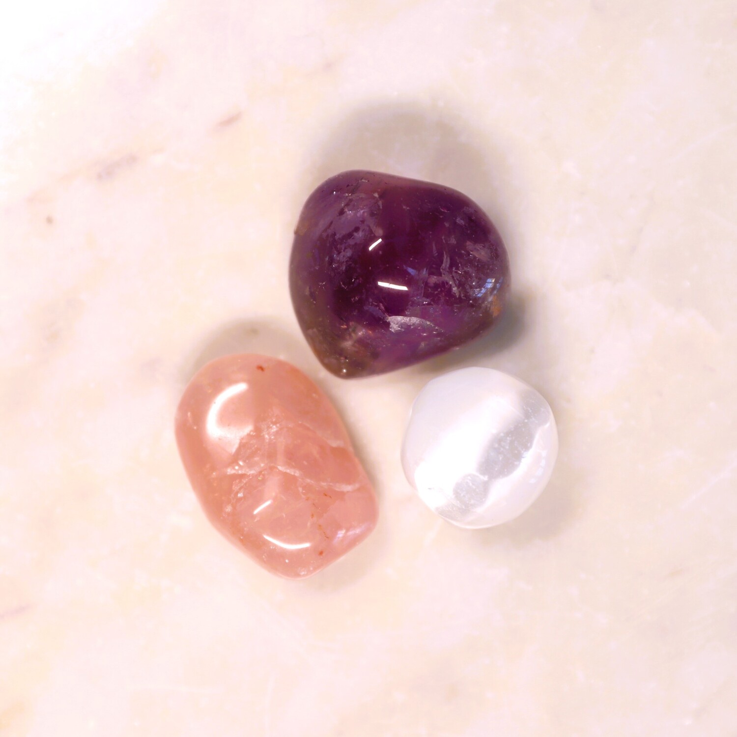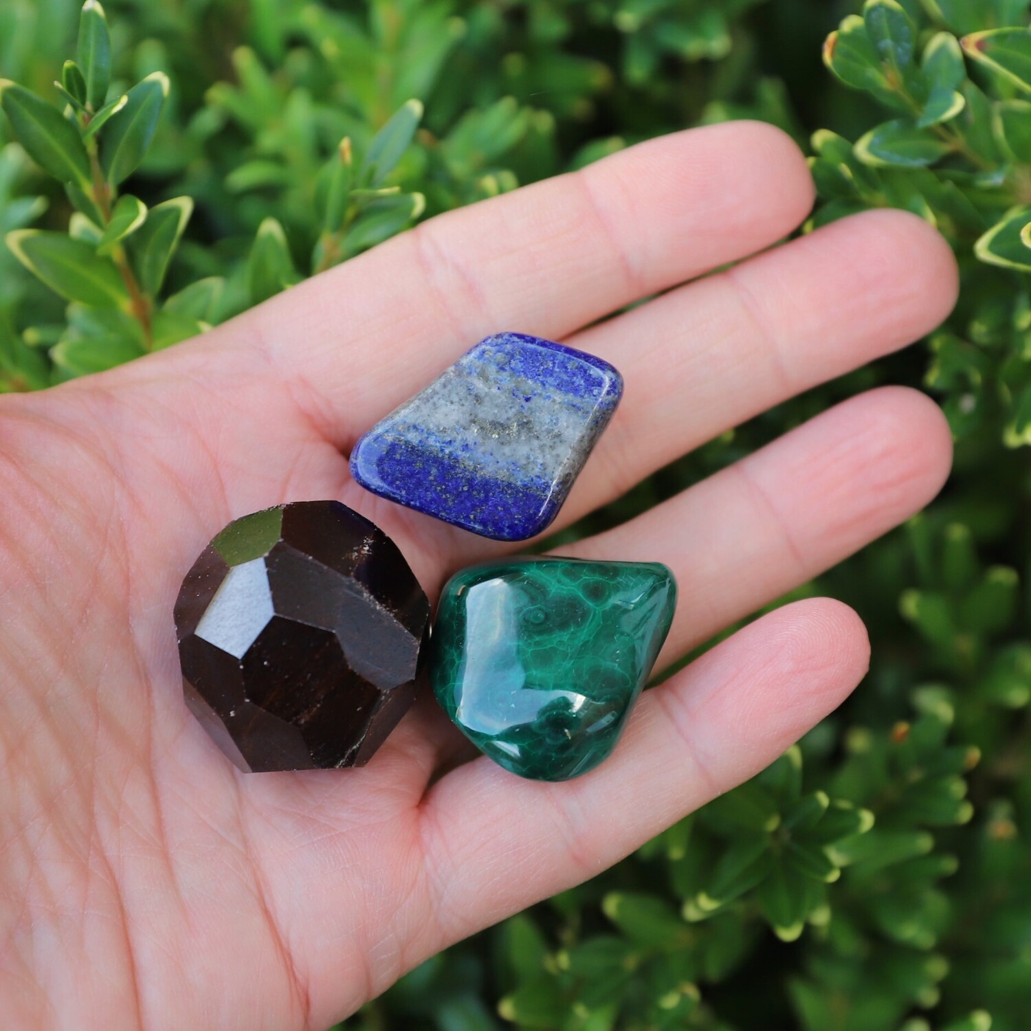 8 crystals: 1 x Faceted Garnet, 1 x Lapis Lazuli tumble stone, 1 x Malachite tumble stone, 1 x Rose Quartz tumble stone, 1 x Amethyst tumble stone, 1 x Selenite Sphere shape, 1 x Selenite Charging Plate, 1 x Selenite rod.