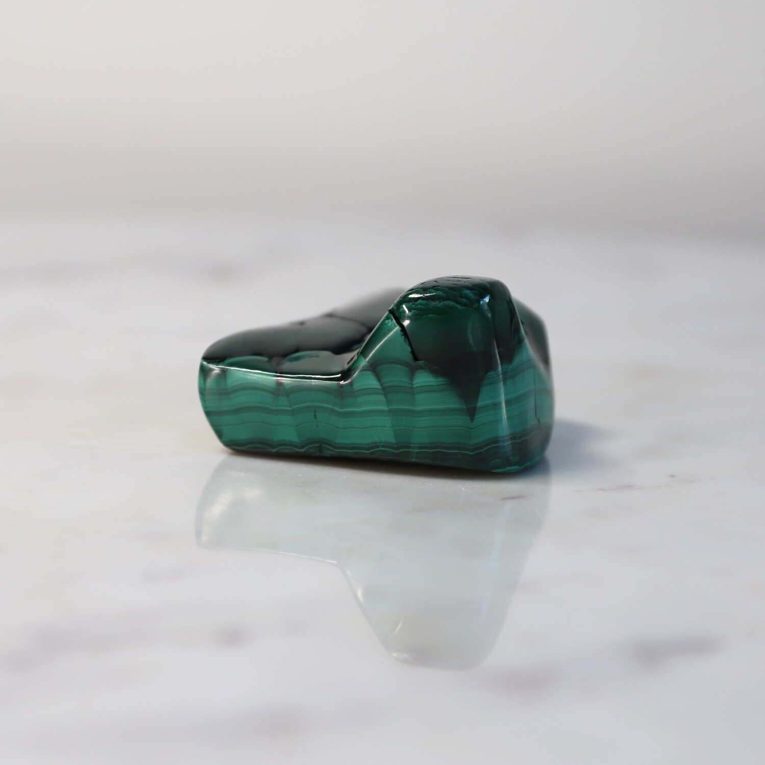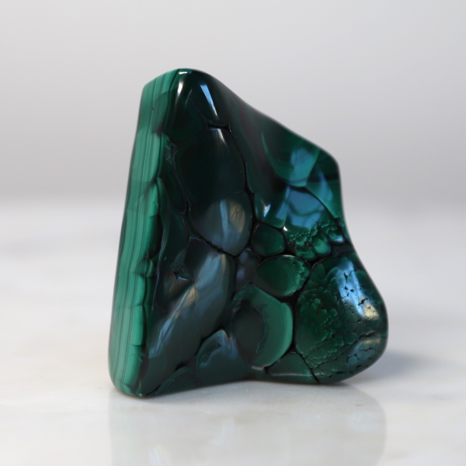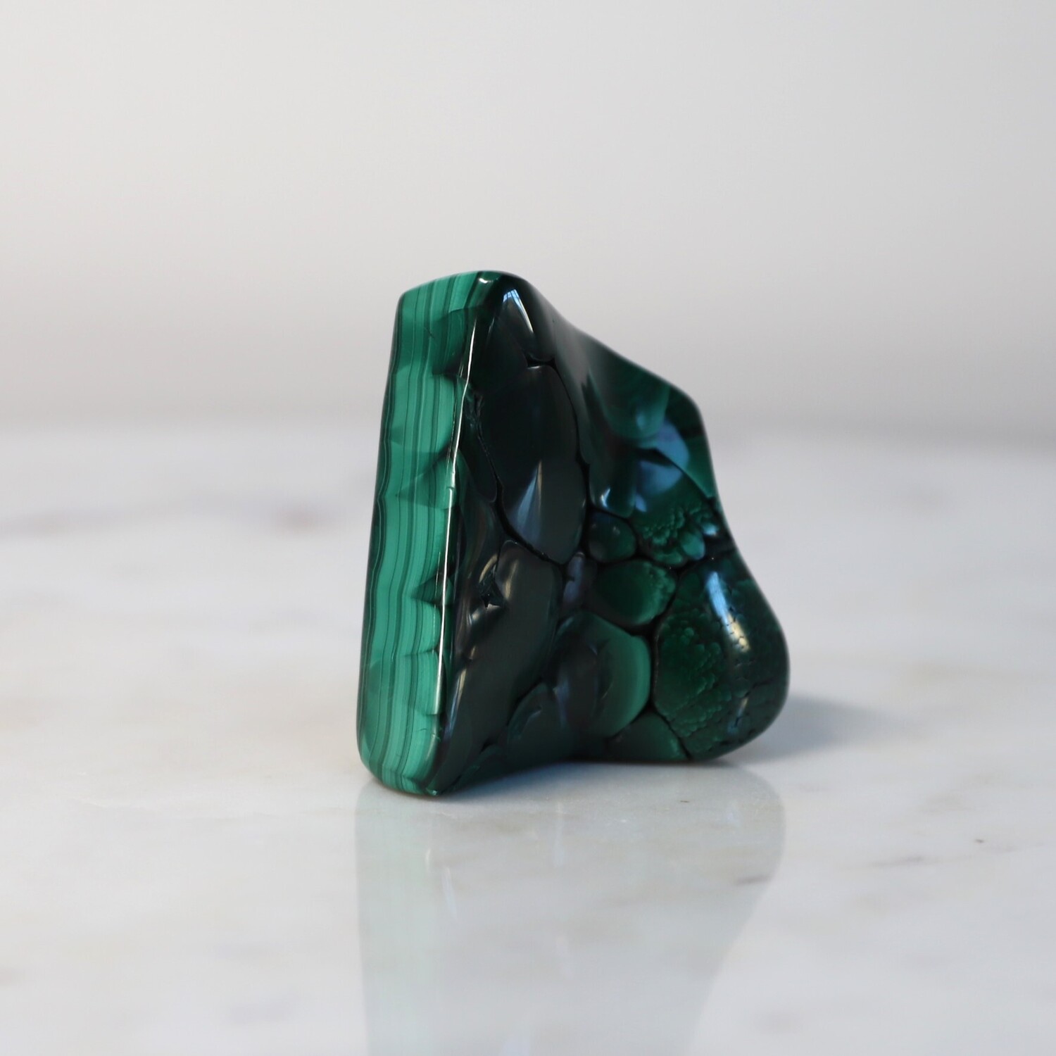 Malachite has historically been known as the stone of transformation, and naturally occurs in swirling shades of green from very dark emerald to brighter greens. It takes its beautiful Green colour from Copper and is often used as a Copper ore. It often appears to have a silky luster with a rippling, patterned surface. Malachite has a varied appearance with a variety of shades and swirls with thick and thin lines, speckles and circles. The value of Malachite will vary according to the size and quality of the piece.