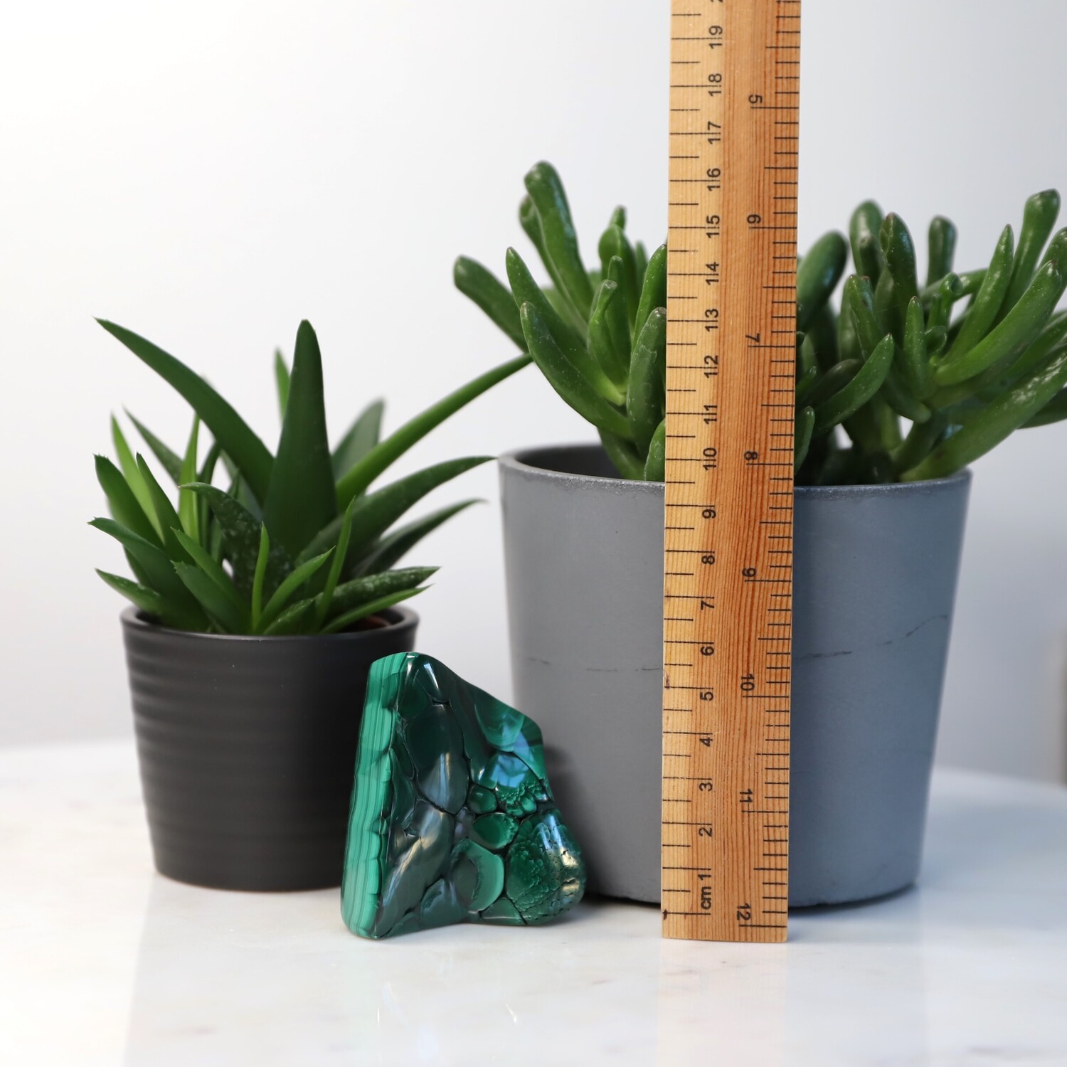 Due to the softer nature of this stone, it is best kept away from water. Water marks will dull the appearance of polished Malachite.