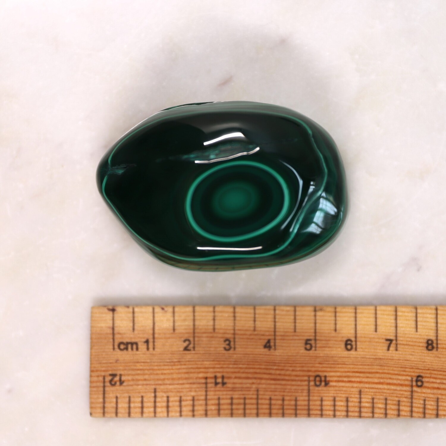 Due to the softer nature of this stone, it is best kept away from water. Water marks will dull the appearance of polished Malachite.