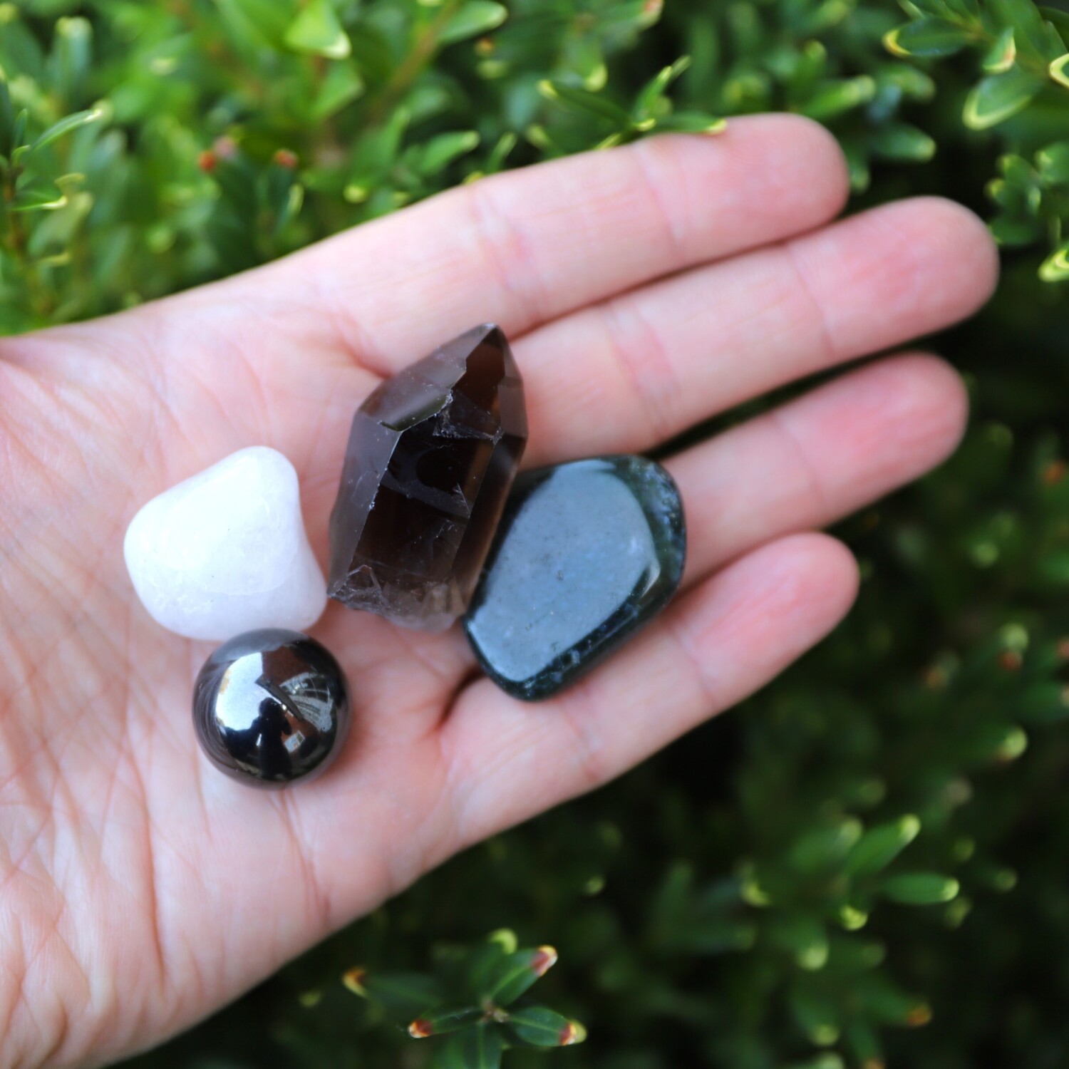 8 Crystals: 1 x Carribean Calcite Tumble Stone, 1 x Hematite Mini Sphere, 1 x Natural Smoky Quartz point, 1 x Quartz Tumble Stone, 1 x Sodalite Tumble Stone, 1 x Carnelian Tumble Stone, 1 x Green Moss Agate Tumble Stone, 1 x Grey/Blue Quartz Tumble Stone, 1 x Selenite Charging plate.