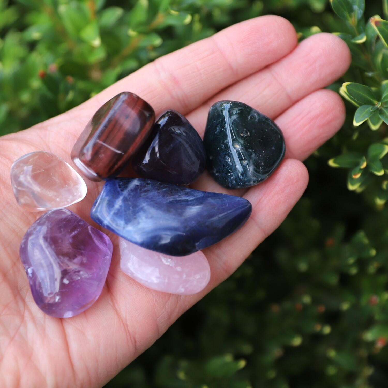 7 Large Tumble Stone Crystals: 1 x Red Tigers Eye Tumble Stone, 1 x Green Moss Agate Tumble Stone, 1 x Sodalite Tumble Stone, 1 x Rose Quartz Tumble Stone, 1 x Amethyst Tumble Stone, 1 x Fluorite Tumble Stone, 1 x Quartz Tumble Stone.