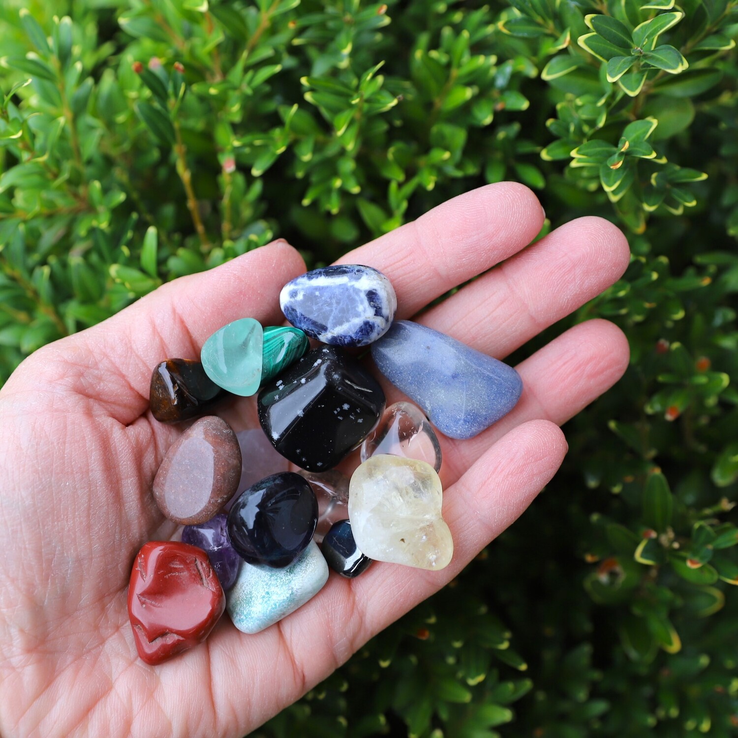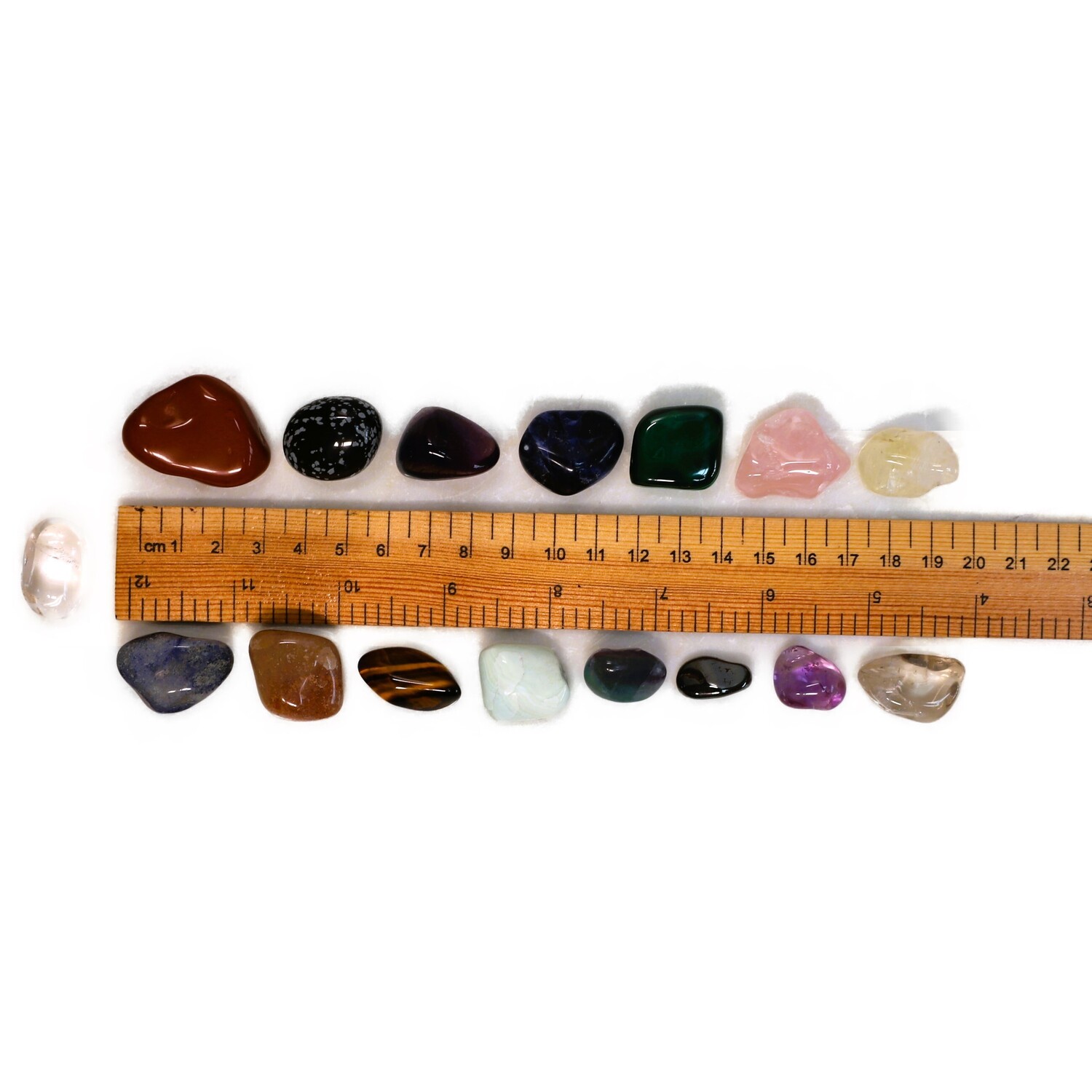 13 Tumble Stone Crystals: 1 x Amethyst Tumble Stone, 1 x Citrine Tumble Stone, 1 x Rose Quartz Tumble Stone, 1 x Tigers Eye Tumble Stone, 1 x Caribbean Calcite Tumble Stone, 1 x Red Jasper Tumble Stone, 1 x Snow Flake Obsidian Tumble Stone, 1 x Fluorite Tumble Stone, 1 x Blue Quartz Tumble Stone, 1 x Hematite Tumble Stone, 1 x Sodalite Tumble Stone, 1 x Malachite Tumble Stone, 1 x Quartz Tumble Stone.