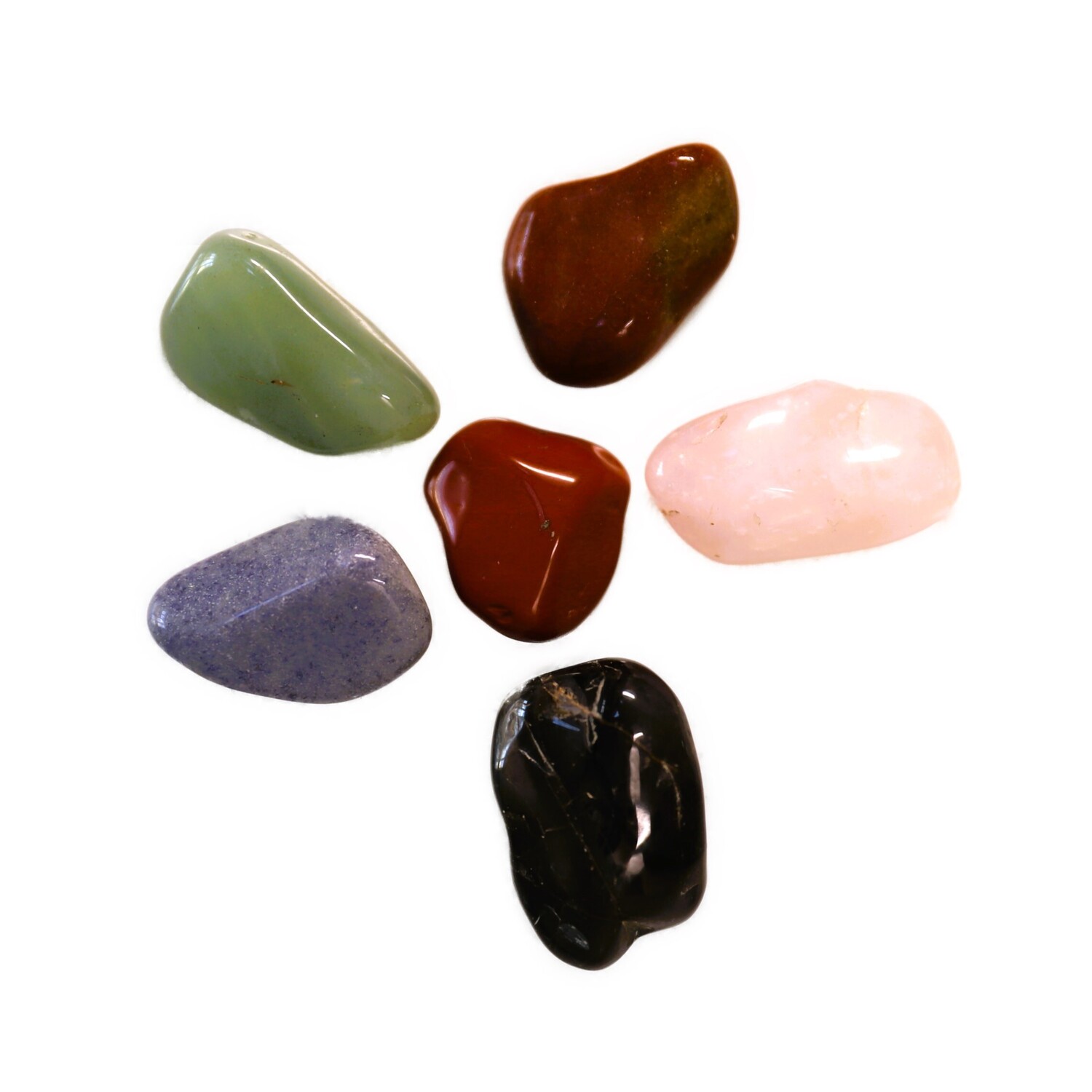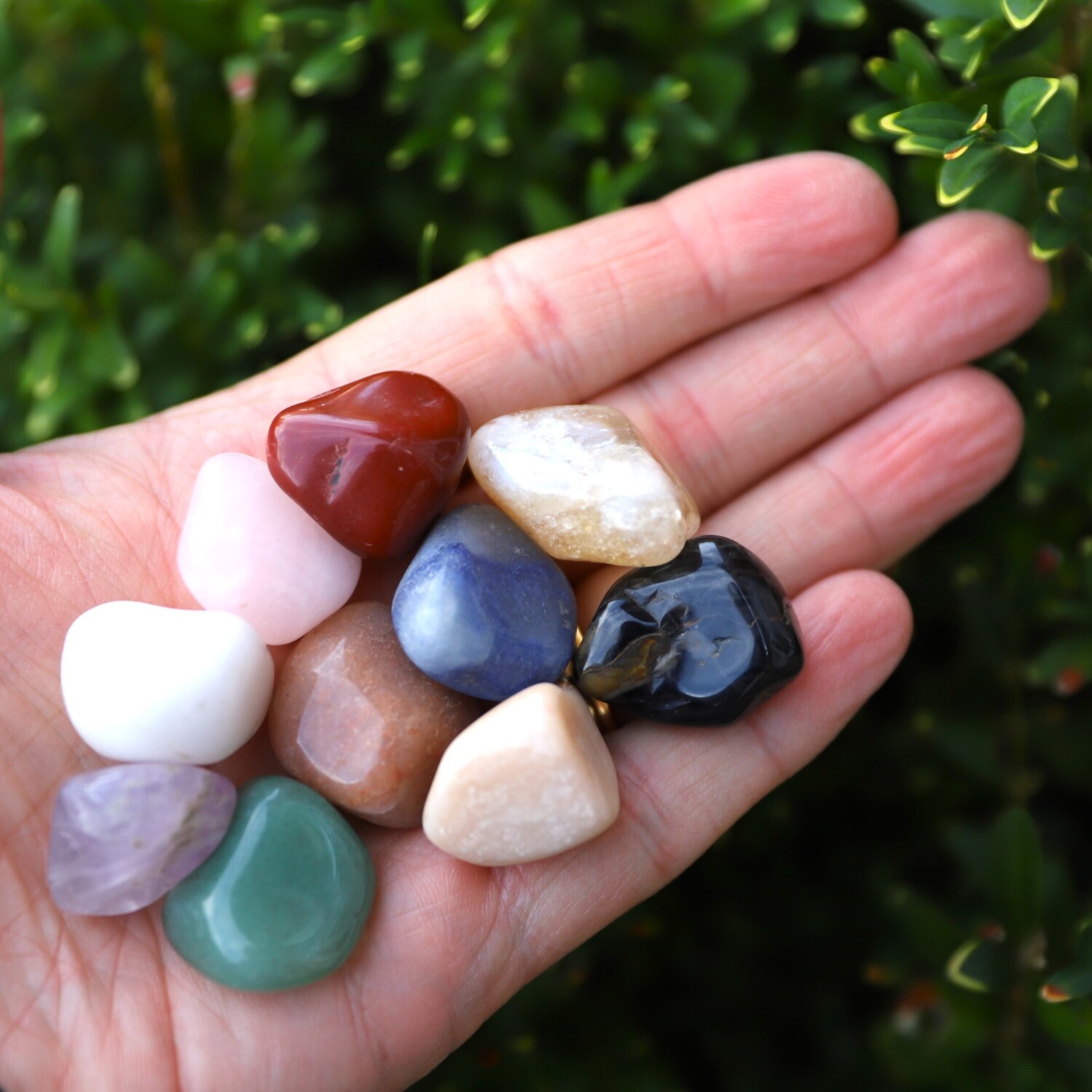 10 Tumble Stone Crystals: 1 x Amethyst Tumble Stone, 1 x Citrine Tumble Stone, 1 x Rose Quartz Tumble Stone, 1 x Tigers Eye Tumble Stone, 1 x Carnelian Tumble Stone, 1 x Red Jasper Tumble Stone, 1 x Snow Quartz Tumble Stone, 1 x Aventurine Tumble Stone, 1 x Blue Quartz Tumble Stone, 1 x Beige Quartz Tumble Stone.