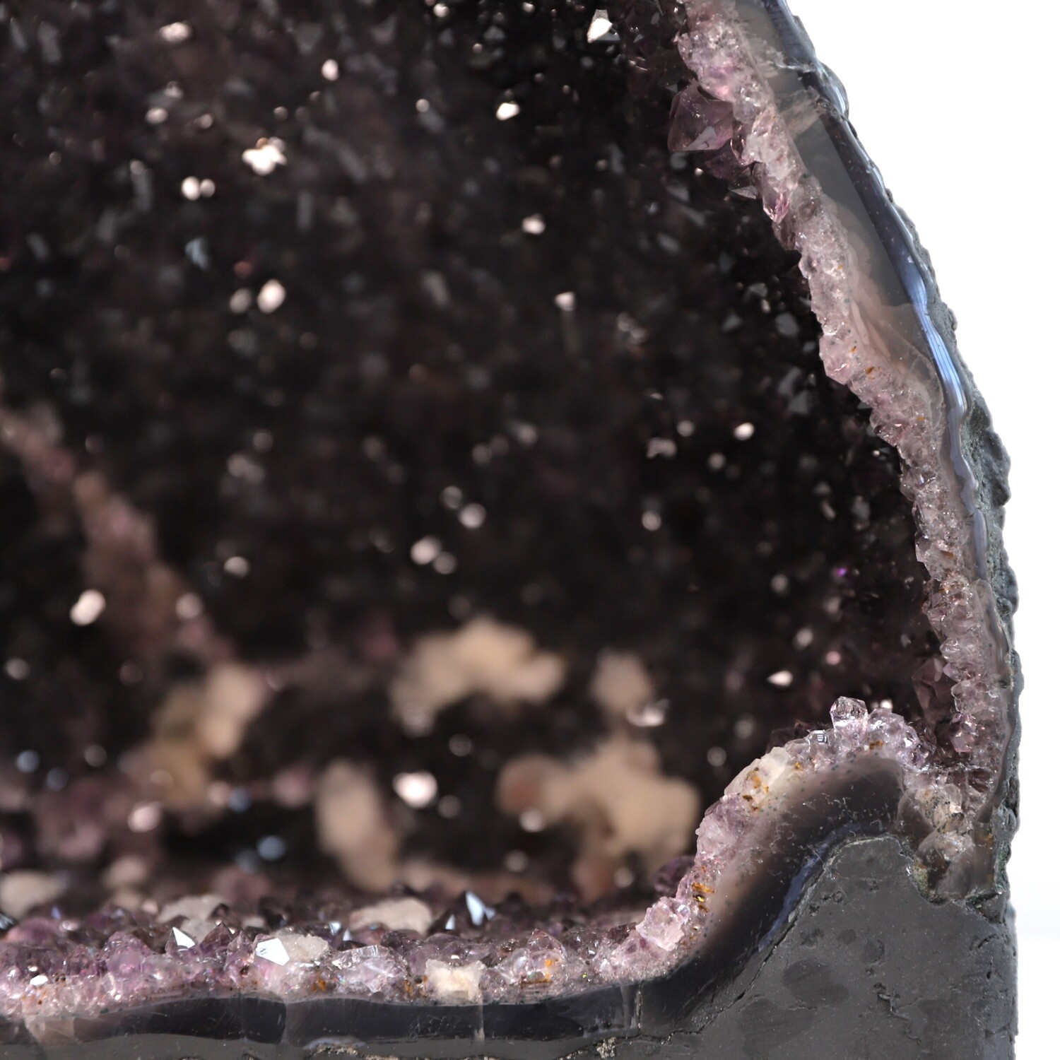 Geology: Amethyst is a variety of Quartz formed in the Earth from a combination of minerals, extreme heat and water, over 130 million years ago. It is found inside pyrogenic volcanic rocks commonly known as Basalts. Amethyst forms in fissures of volcanic rocks where there was once very hot volcanic lava, (50-250°c) silica enriched water, trace amounts (10-100ppm) of ferric iron (Fe3+).